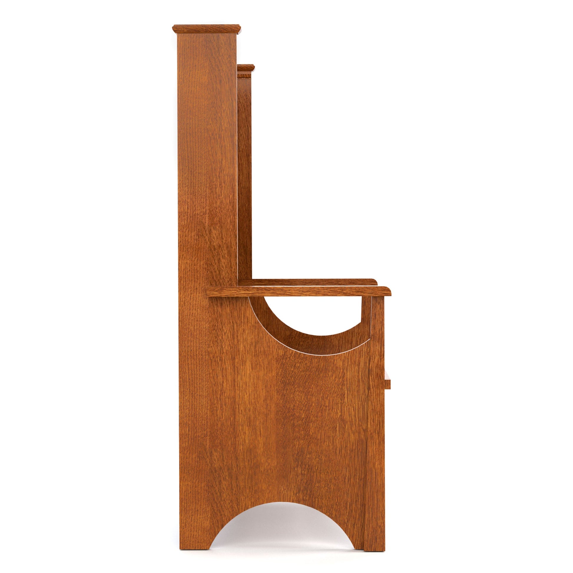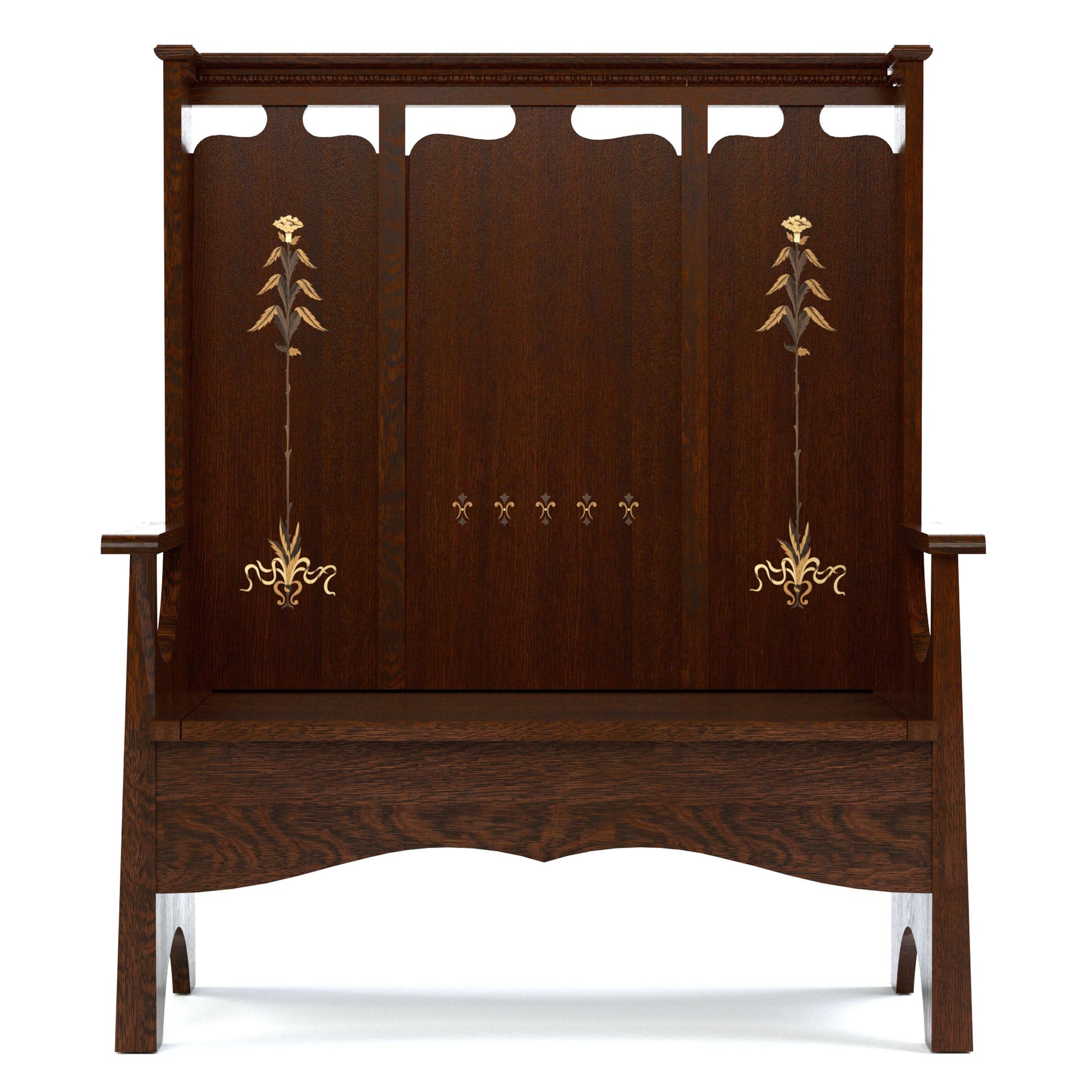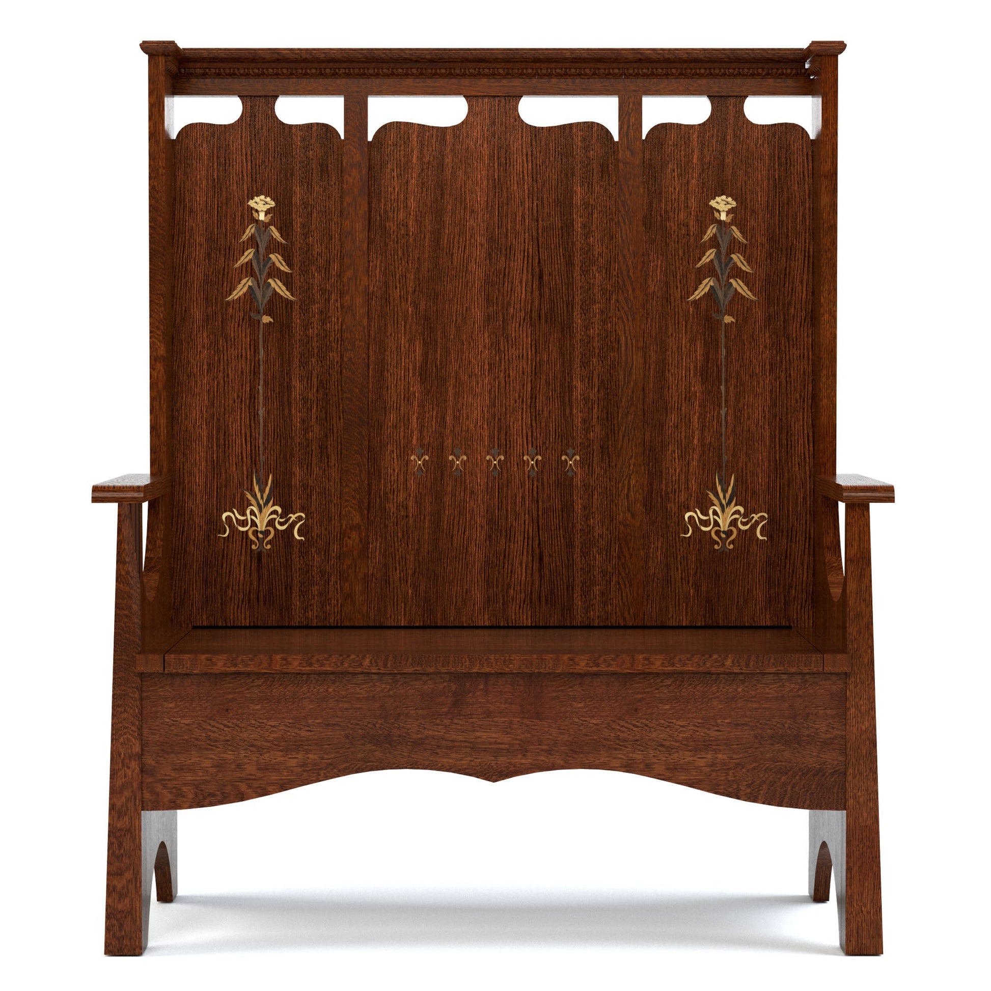 Le banc Fireside, inspiré d'un modèle Stickley Bros. de 1902, est un banc à haut dossier souvent disposé par deux près d'une cheminée, créant un coin douillet où se réchauffer. Notre version 125e anniversaire est un banc de rangement polyvalent et attrayant, idéal pour les entrées, les vestiaires, les salons et bien plus encore. Fabriqué en chêne blanc scié sur quartier, il se distingue par son dossier légèrement incliné de style triptyque, son assise à charnière dissimulant un espace de rangement et son superbe motif de marqueterie aux nuances subtiles et aux détails subtils, créés par un brûlage minutieux du placage.