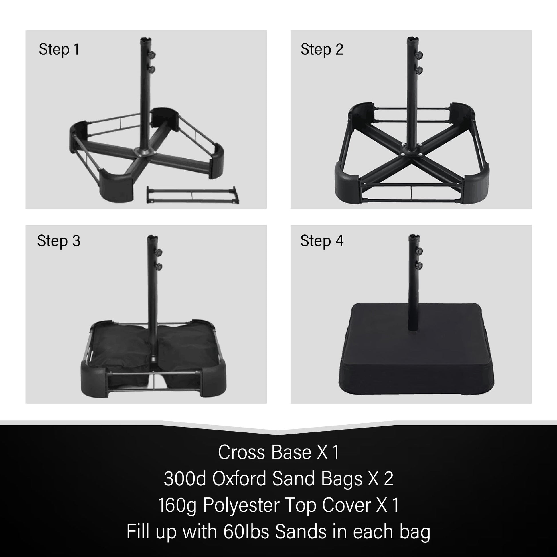 - Base incluse (base croisée + deux sacs de sable + un couvercle supérieur)