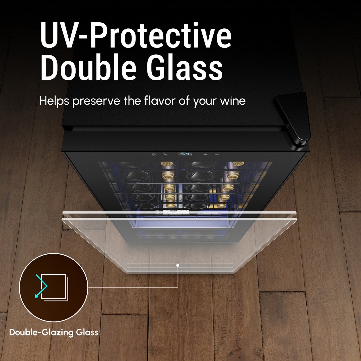 - Préservez la qualité de votre vin grâce à notre porte vitrée à double vitrage anti-UV. Cette fonction bloque les rayons UV nocifs, préservant ainsi la saveur et l'arôme de votre vin.