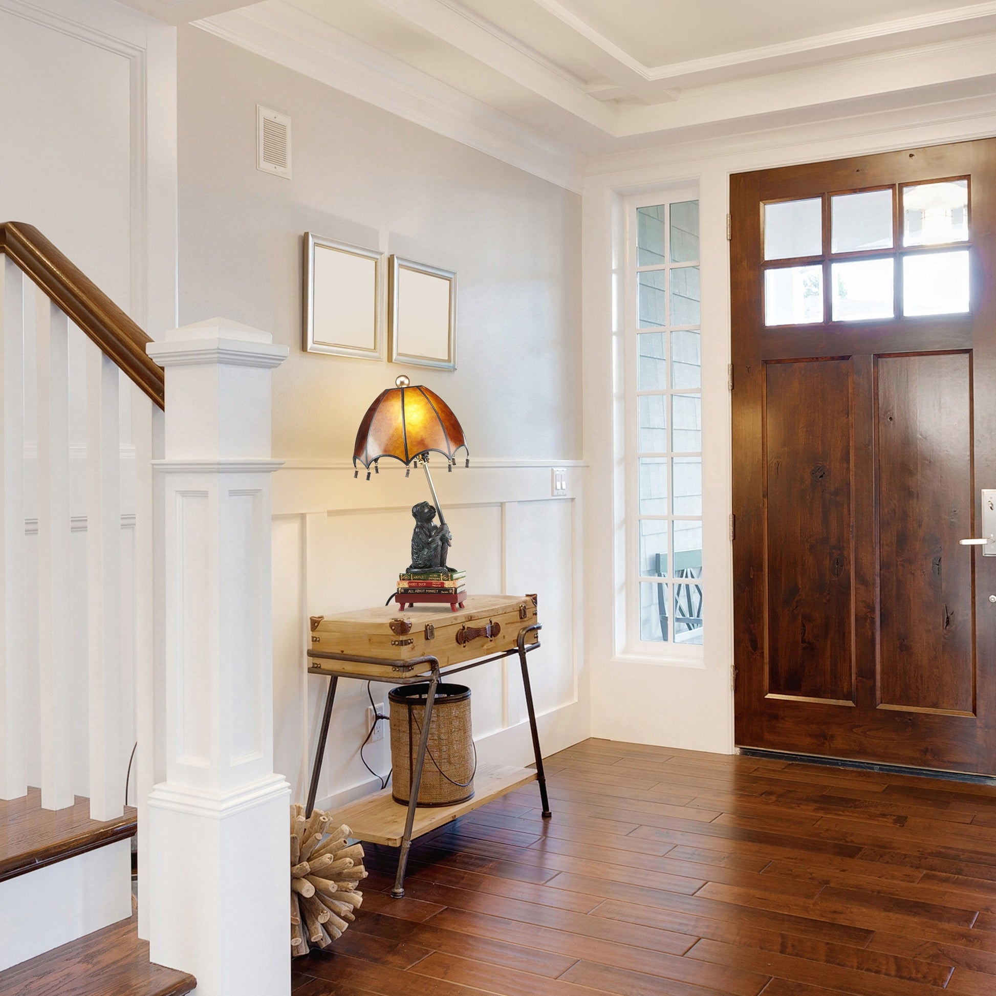 Cette lampe de table traditionnelle présente un magnifique mélange de mica ambré et de polyrésine dans une finition multicolore, créant un design chaleureux et confortable. Son pied original en polyrésine représente un singe intellectuel assis sur une pile de livres, tandis que son abat-jour en mica en forme de dôme et de parapluie crée une ambiance apaisante. Dotée d'un interrupteur rotatif et d'un cordon de 157 cm, elle est idéale pour une installation et une utilisation faciles. Elle apportera une touche de fantaisie et d'élégance à n'importe quelle pièce.