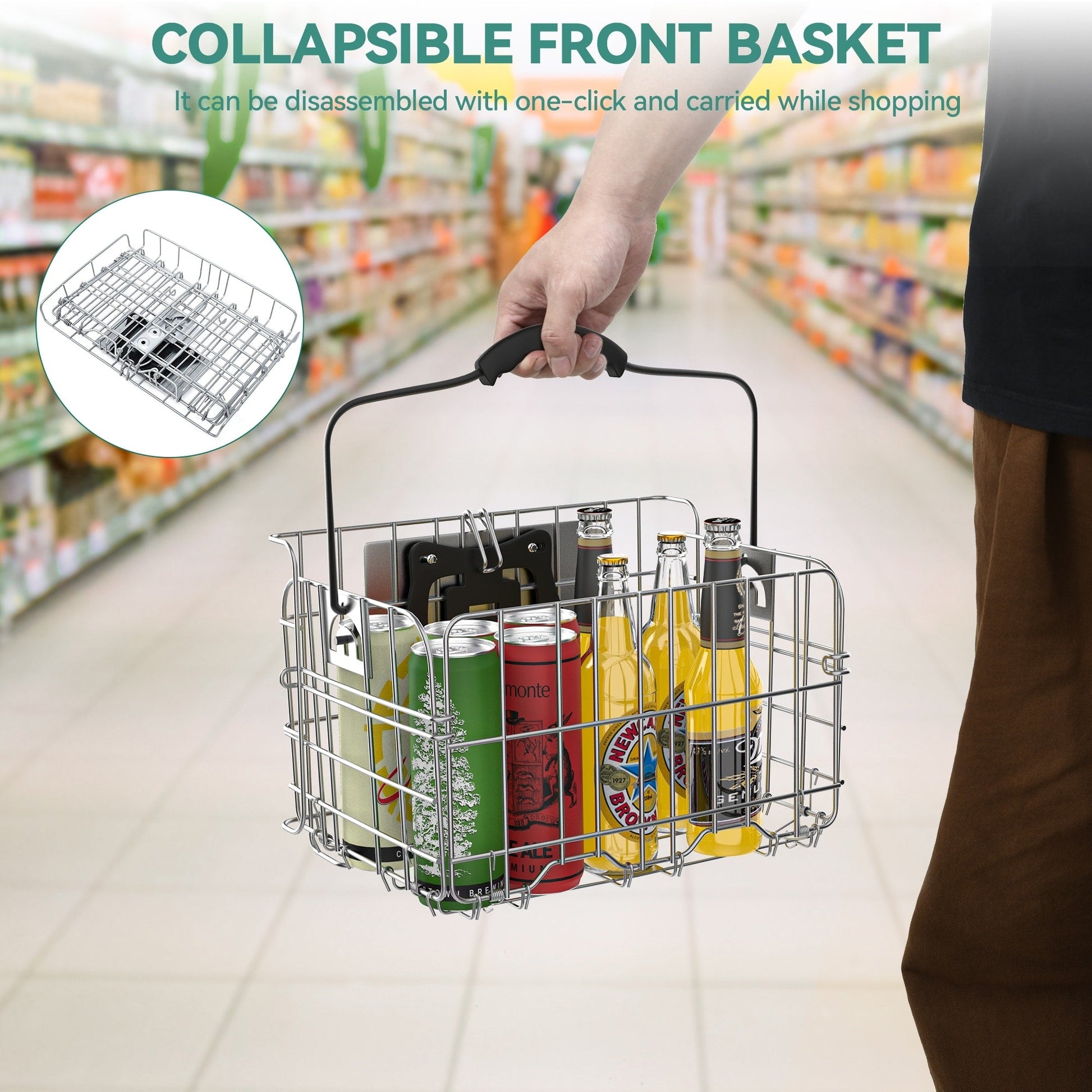 - Le panier avant est pliable et amovible, et vous pouvez le transporter pour faire vos courses avec un simple bouton de démontage