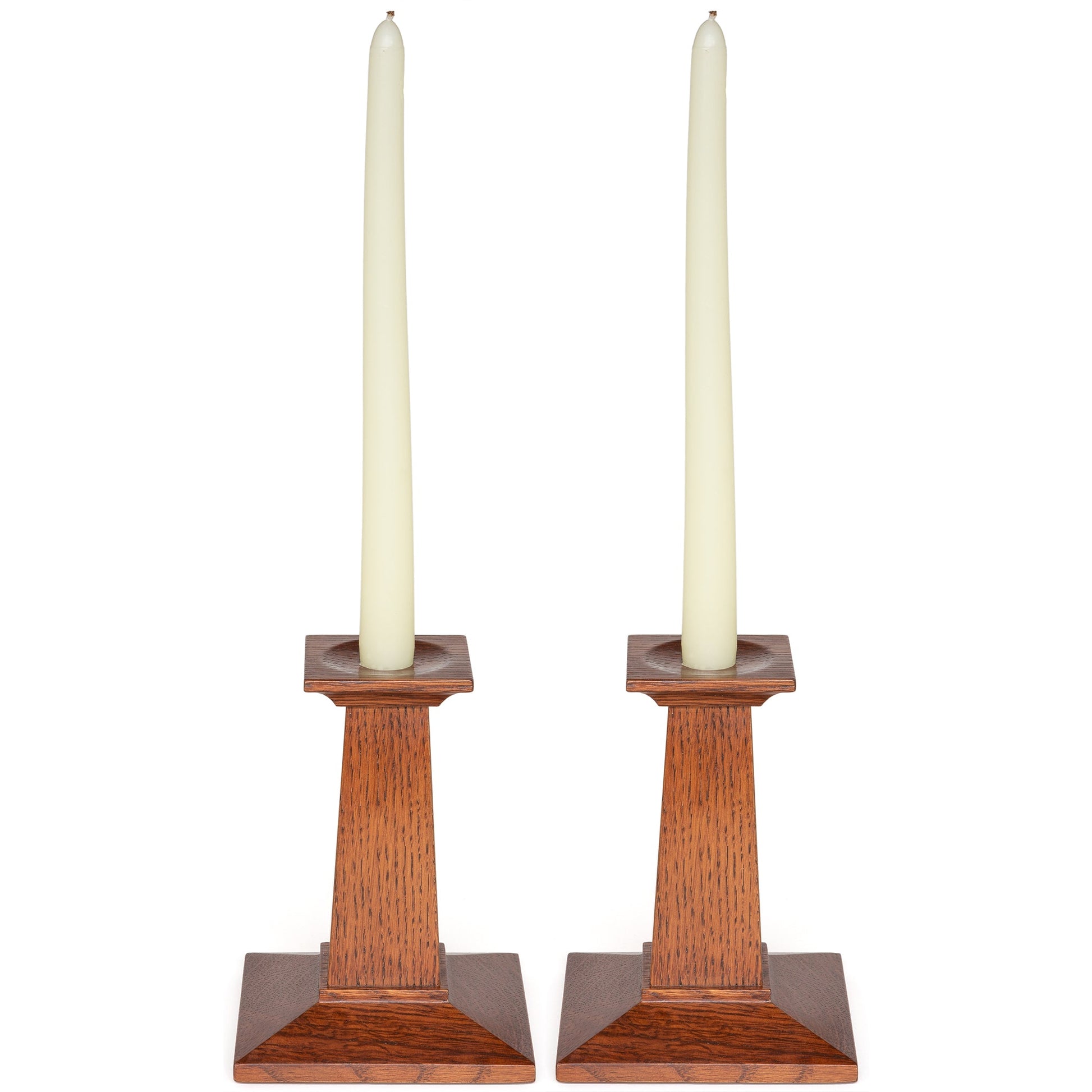Les bougeoirs Mission fuselés en bois massif subliment une pièce élégante. Adaptés d'un modèle de L. & JG Stickley de 1910, chaque paire est fabriquée avec des poteaux et des moulures en chêne massif dans notre finition Onondaga classique et peut accueillir des bougies d'une largeur de 1,9 cm.