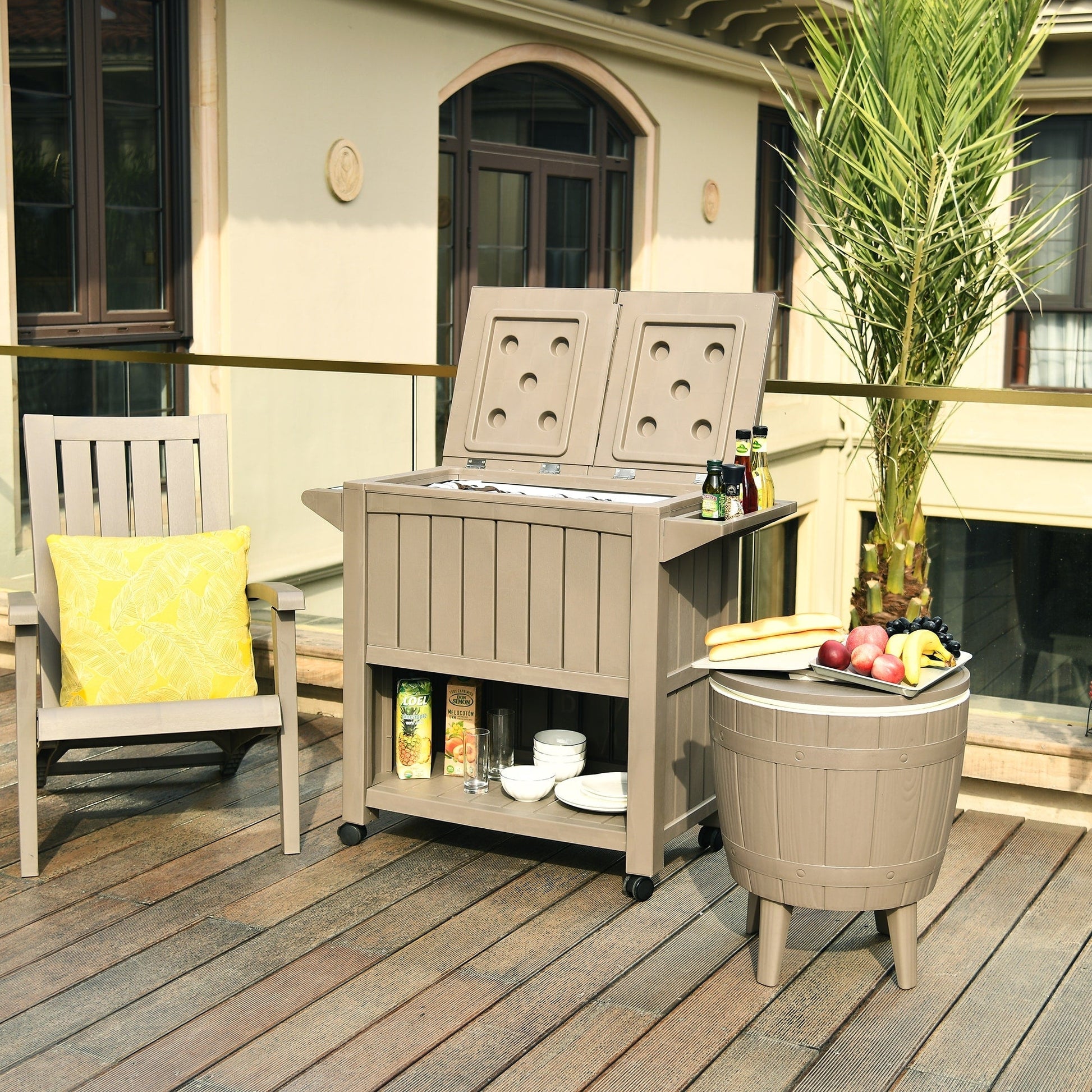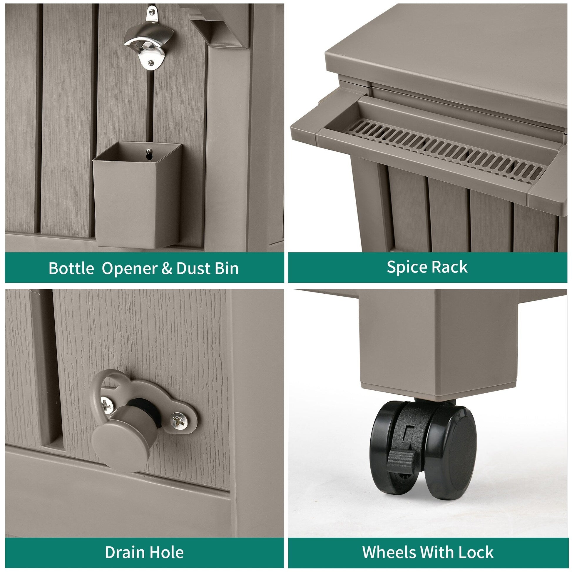 GRANDE CAPACITÉ - Ce chariot de glacière de patio est livré avec un seau à glace de 85 pintes/21 gallons et un espace de rangement ouvert pour refroidir vos boissons pendant des heures.ACCESSOIRES MULTIFONCTIONNELS - Comprend des conceptions distinctes polyvalentes, y compris un décapsuleur, une poubelle assortie, un support à épices et un espace de rangement inférieur pour plus de commodité, ainsi que le sac de glace en PVC avec des trous de drainage pour remplacer facilement l'eau ou les glaçons.ROULETTES VERROUILLABLES - La glacière à roulettes bénéficie de 4 rouleaux multidirectionnels, dont 2 sont verrouillables pour maintenir la glacière en place pour une stabilité supplémentaire sur des surfaces inégales.ASSEMBLAGE RAPIDE - Ce chariot à boissons d'extérieur est fabriqué à partir de résine recyclable et durable pour un entretien facile ; Suivez simplement les instructions incluses pour une installation facile.MATÉRIAUX DE QUALITÉ SUPÉRIEURE - Nos chariots de glacière à roulettes sont construits en résine résistante aux intempéries avec une texture de bois naturel pour une grande durabilité, une protection contre le pelage et les bosses, un look élégant et un toucher minimal.
