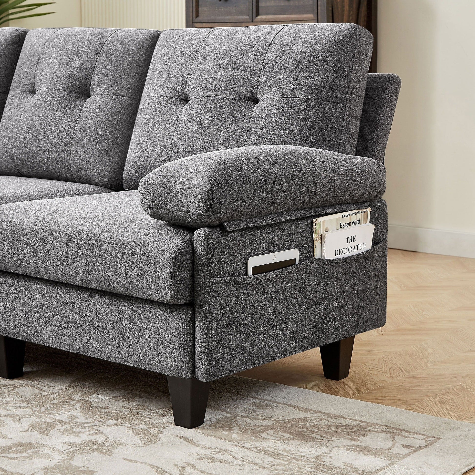 Créez un espace de vie confortable et moderne avec notre canapé d'angle moderne en L avec pouf et sacs de rangement latéraux. Ce canapé contemporain rembourré est fabriqué dans des tissus doux et s'agence de multiples façons pour s'adapter aux petits comme aux grands espaces. Le coussin de dossier ergonomique épouse parfaitement le dos et le soutient fermement, tandis que les coussins en mousse haute densité offrent un confort et un soutien optimaux. Deux sacs de rangement latéraux permettent de ranger facilement vos petits appareils électroménagers. La structure du canapé est entièrement en bois dur de haute qualité, ce qui la rend robuste et durable, et le pouf est amovible pour un rangement facile. Le montage est simple et sans outils.