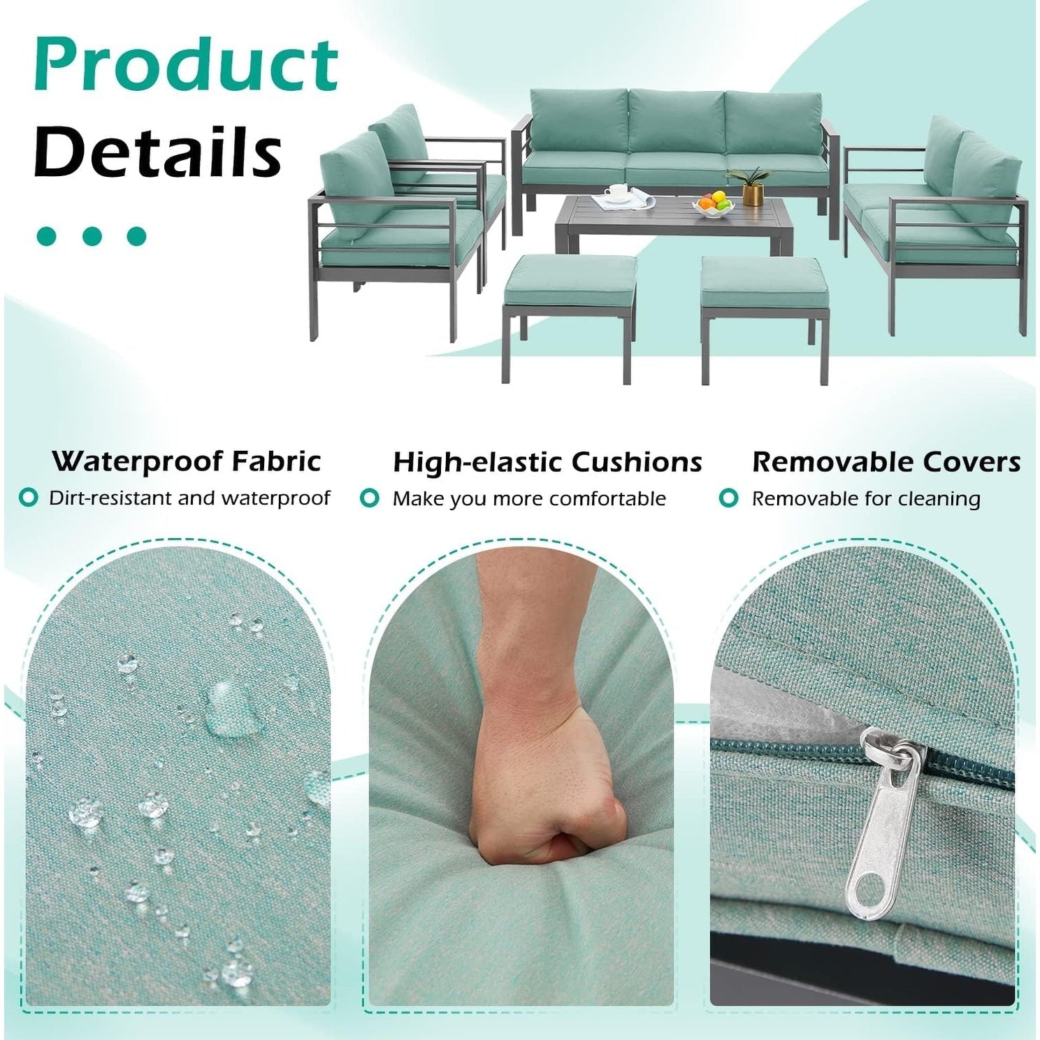 Profitez du plein air avec l'ensemble de jardin 7 pièces AECOJOY en aluminium. Cet élégant ensemble de patio est fabriqué en aluminium durable avec des coussins épais et résistants à l'eau et un design moderne qui s'intègre à tout espace extérieur. Il comprend un canapé 3 places, une causeuse, deux fauteuils simples, deux poufs et une table basse, ainsi qu'un pied de support central pour plus de stabilité et de sécurité. Toutes les pièces sont faciles à assembler grâce aux outils et aux instructions fournis.