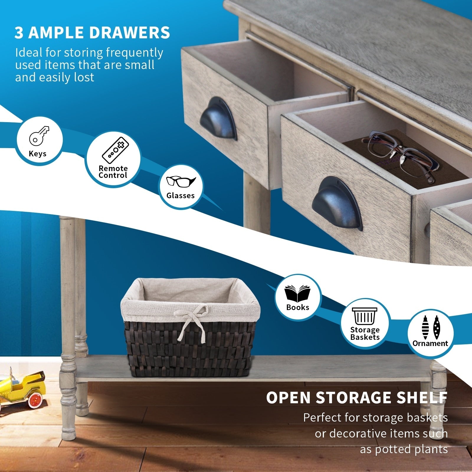 【FONCTIONNEL】Cette console d'entrée est idéale pour exposer des objets décoratifs tels que des vases, des cadres photo et des livres. Son étagère centrale offre un espace supplémentaire pour les magazines ou les petits objets délicats, tandis que ses tiroirs offrent des rangements dissimulés.