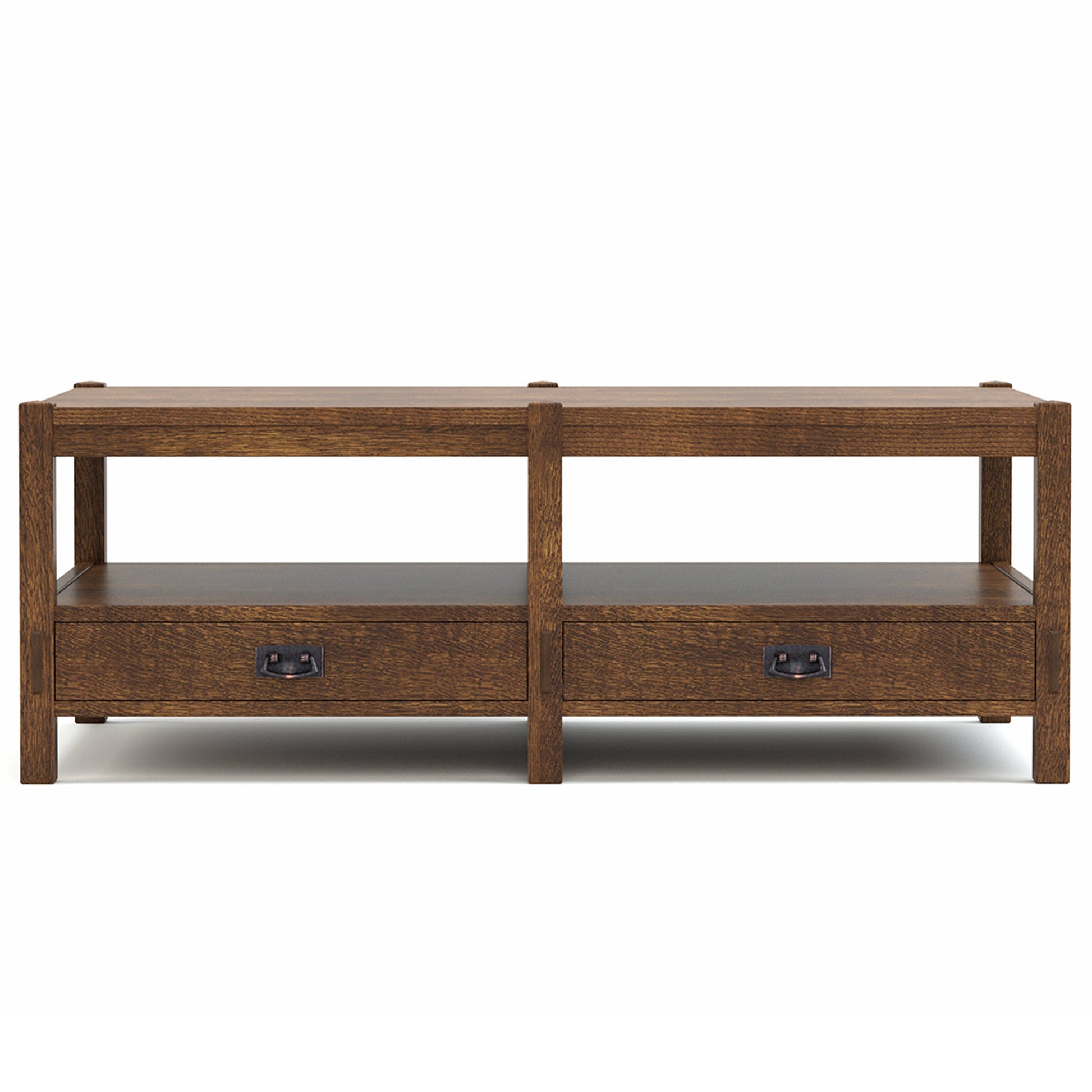Le groupe d'appoint Chenango offre un style épuré avec des détails Mission subtils mais caractéristiques, notamment des tenons traversants, des montants traversants à plateau pyramidal et des poignées de style vintage en cuivre foncé. Sur la table basse Chenango, un second espace fonctionnel, sous le plateau en chêne massif, est créé par deux tiroirs traversants à ouverture latérale et à guidage central.