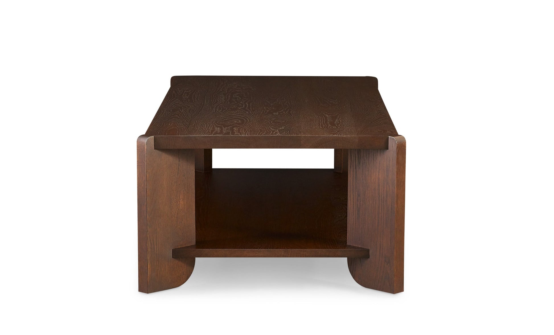 La table basse Dearborn est composée de larges dalles de chêne blanc américain, assemblées avec art. Ses lourds pieds, allégés par une courbe radiale ascendante, forment un angle de 45 degrés avec les angles et sont délicatement entrecoupés par une étagère basse. Le plateau rectangulaire est encastré à la hauteur des pieds, et chaque surface révèle le veinage spectaculaire du bois.