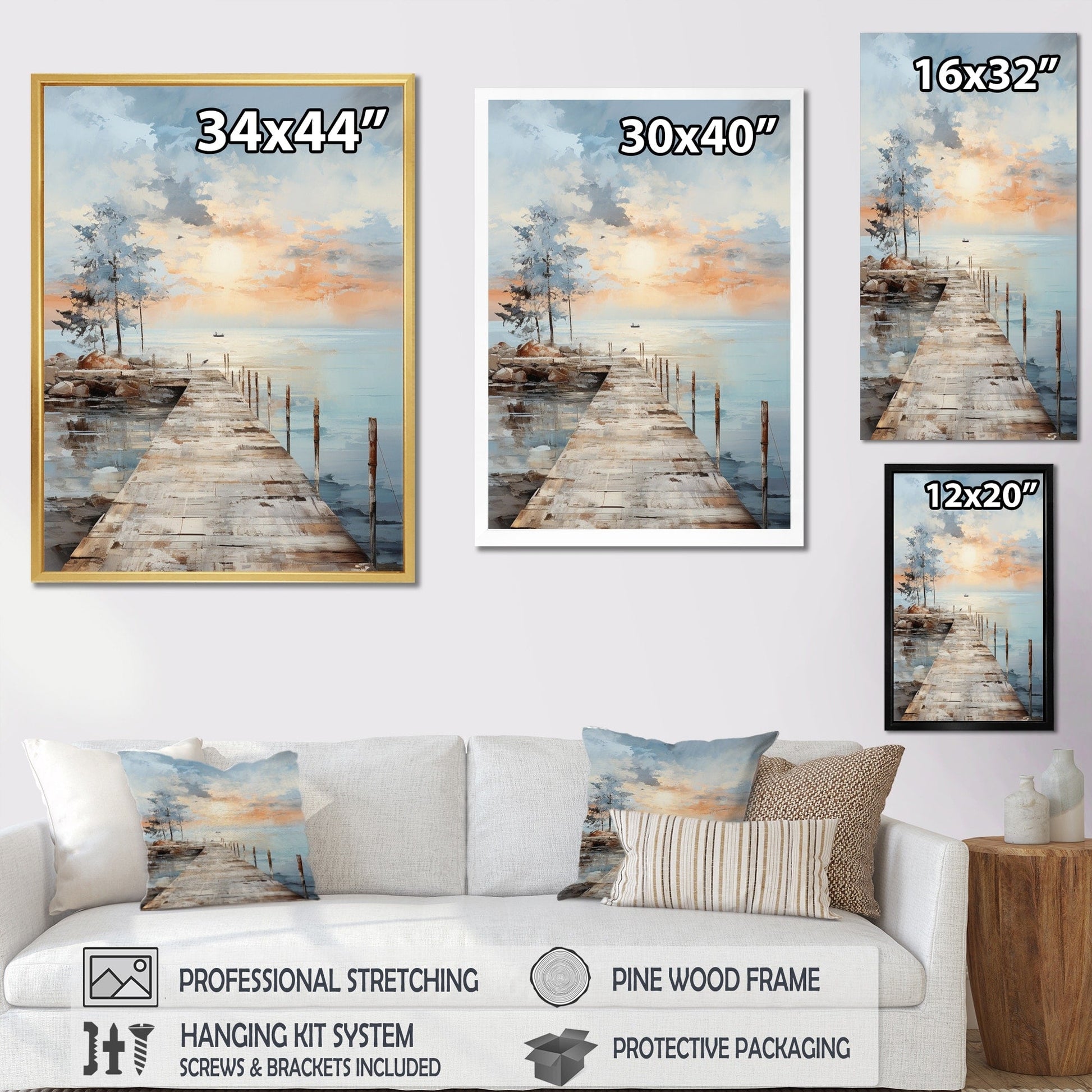 Cette magnifique toile « Jetée et quai en bord de mer III » est imprimée sur toile avec une encre de la plus haute qualité, résistante à la décoloration. Chaque toile est imprimée sur une toile de coton de première qualité. Chaque toile est tendue sur un châssis en bois de 2,5 cm pour les petits formats ou de 3,8 cm pour les grands formats (76 x 102 cm, 86 x 112 cm, etc.), garantissant ainsi une bonne tension de la toile et son maintien.