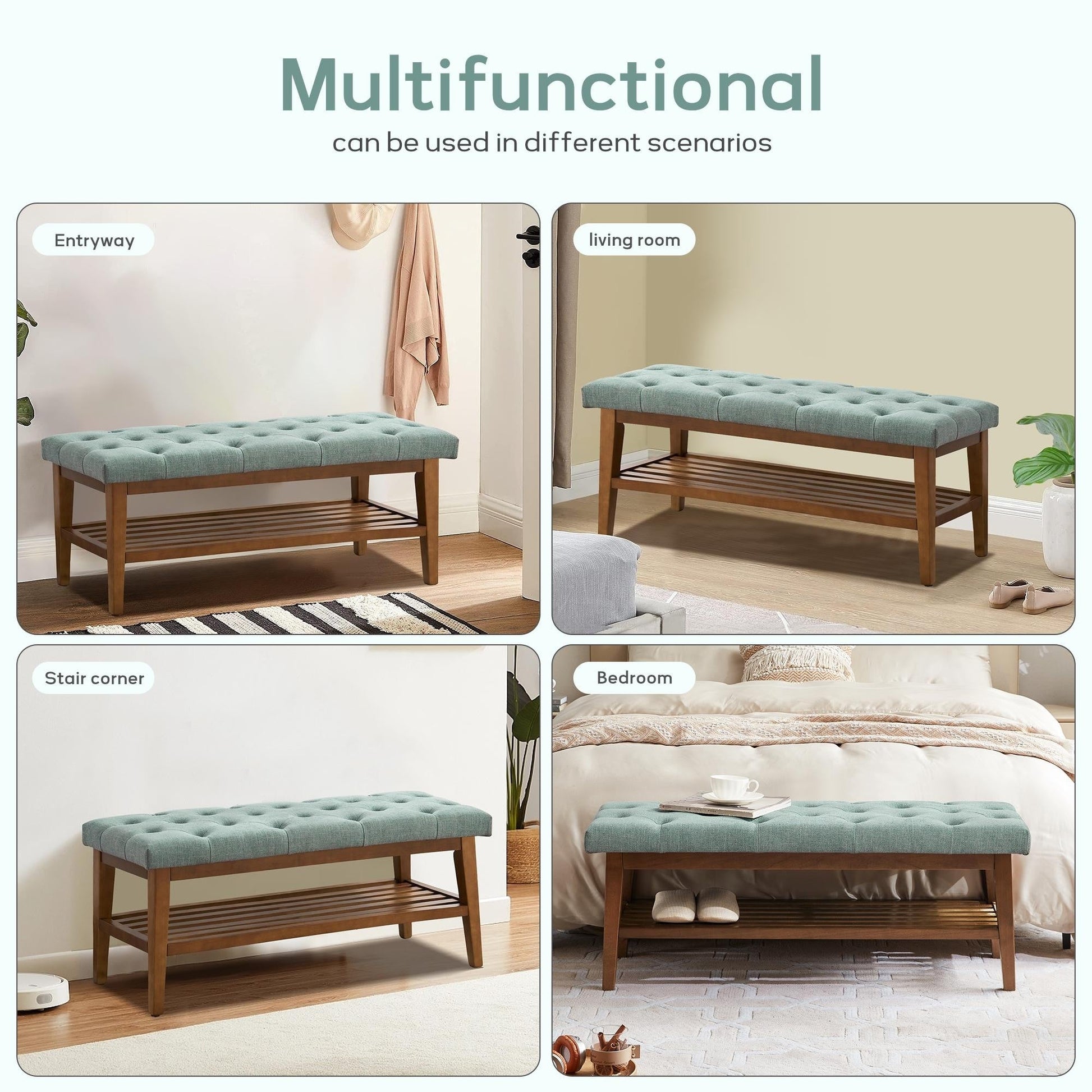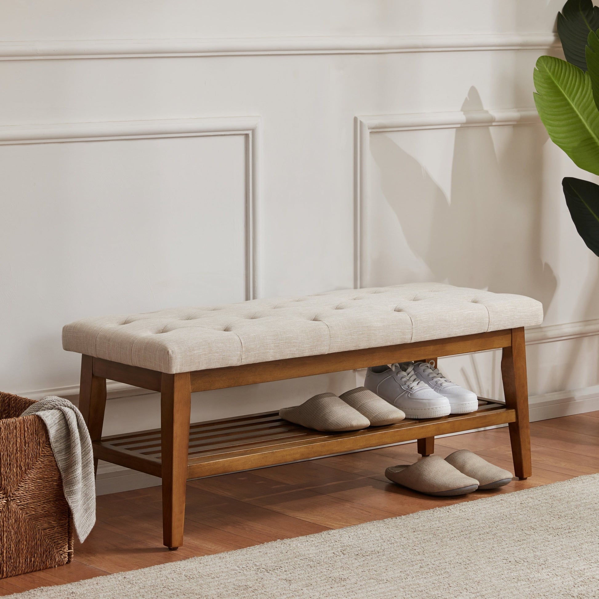 Banc à chaussures d'entrée, banc de rangement en tissu et bois massif, banc rembourré de 43 pouces pour salon et chambres