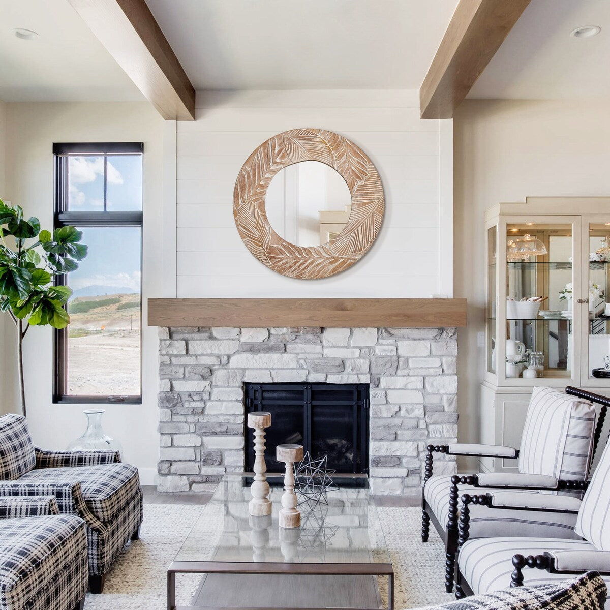 Miroir mural rond en bois sculpté de style ferme - 28 x 28