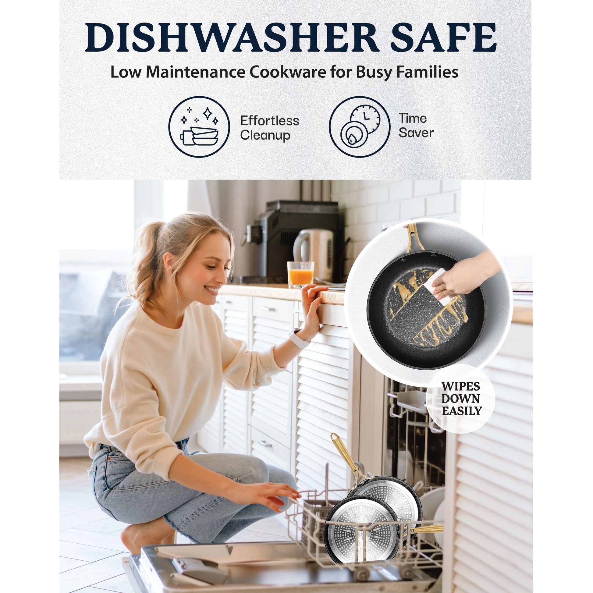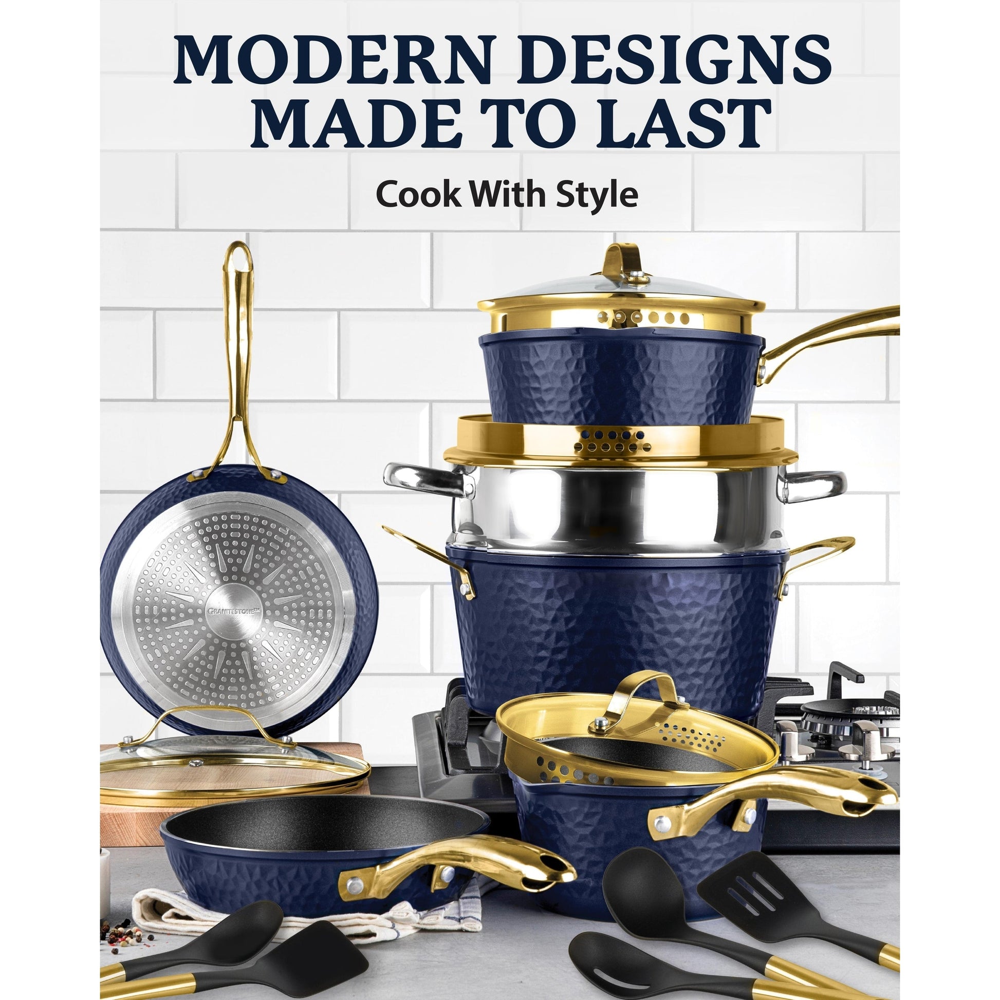 Réinventez vos dîners de semaine avec la batterie de cuisine Granitestone Charleston, 10 fois plus durable et ultra-résistante. Cet ensemble de 15 pièces comprend une poêle de 2,4 m, une poêle de 3 m avec couvercle, une casserole de 1,5 l avec couvercle, une casserole de 2,5 l avec couvercle, une marmite de 5 l avec couvercle, un panier vapeur en acier inoxydable et un ensemble de 5 ustensiles. Fabriqué avec trois couches d'une durabilité exceptionnelle, dont un revêtement 10 fois plus durable que les revêtements classiques, cet ensemble de casseroles et poêles est conçu pour vous accompagner au quotidien en cuisine. Sa surface antiadhésive permet aux aliments de glisser facilement et est facile à nettoyer. Peu ou pas d'huile ni de beurre sont nécessaires et chaque pièce est fabriquée sans PFOA, PFOS, plomb ni cadmium, pour une cuisine plus saine. Sa conception compatible lave-vaisselle, compatible avec les ustensiles en métal et résistante aux rayures, simplifie considérablement la cuisson et le nettoyage. Chaque pièce est équipée d'une base à induction et passe au four jusqu'à 260 °C, vous permettant de cuisiner comme vous le souhaitez. Les poignées ergonomiques dorées restent froides au toucher pour un confort optimal pendant la cuisson. Pour couronner le tout, son style campagnard moderne et son design martelé allient élégance et durabilité.