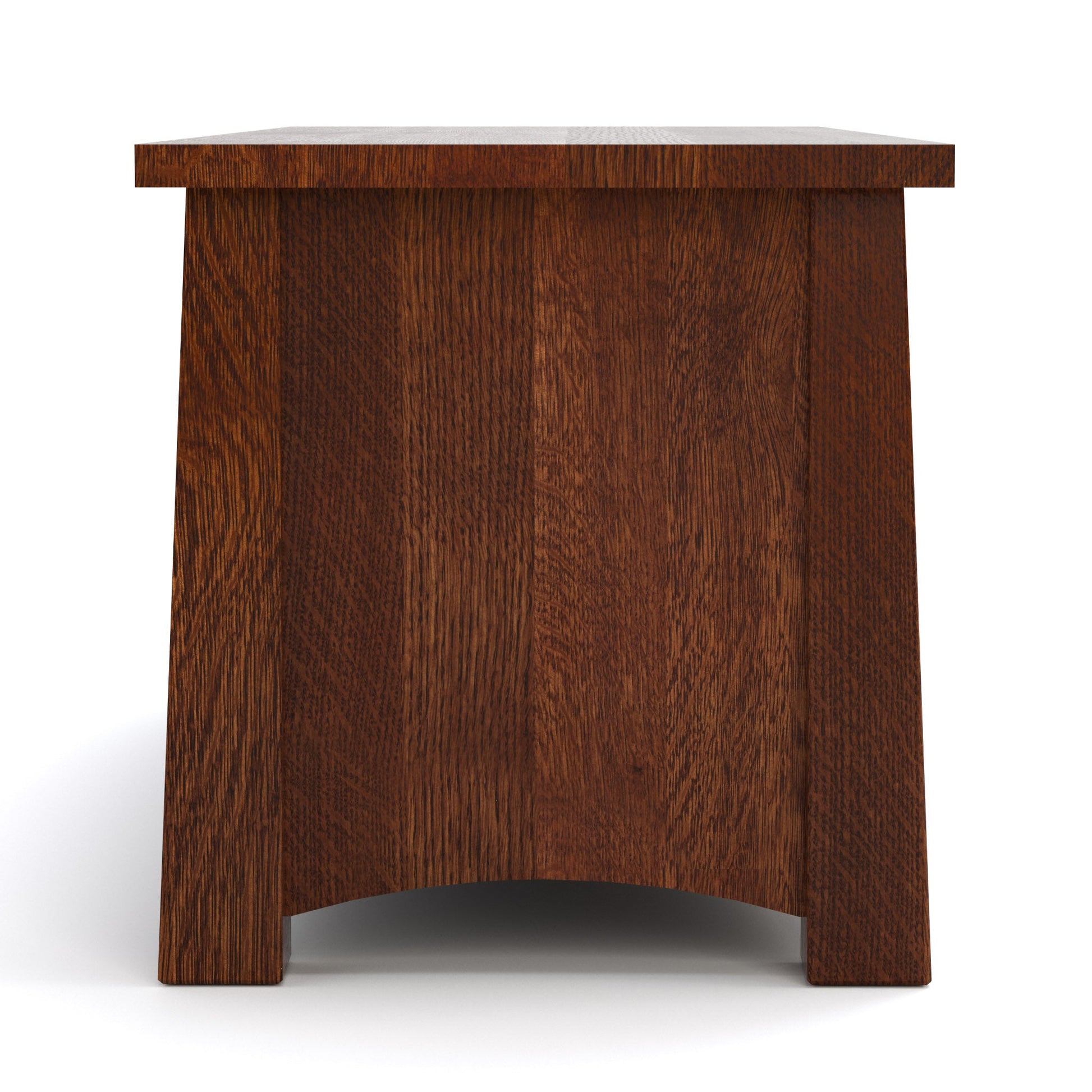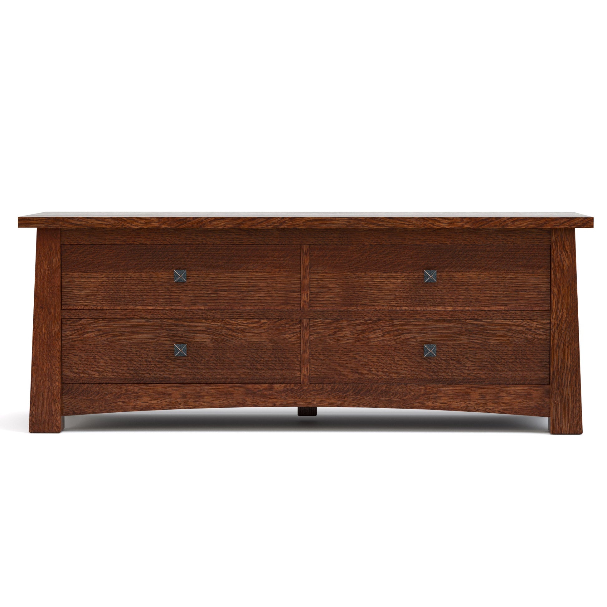 D'une hauteur de seulement 48 cm, cette magnifique commode peut servir de banc gain de place au pied du lit. Elle est dotée de deux larges tiroirs avec poignées pyramidales carrées et faux montants centraux.