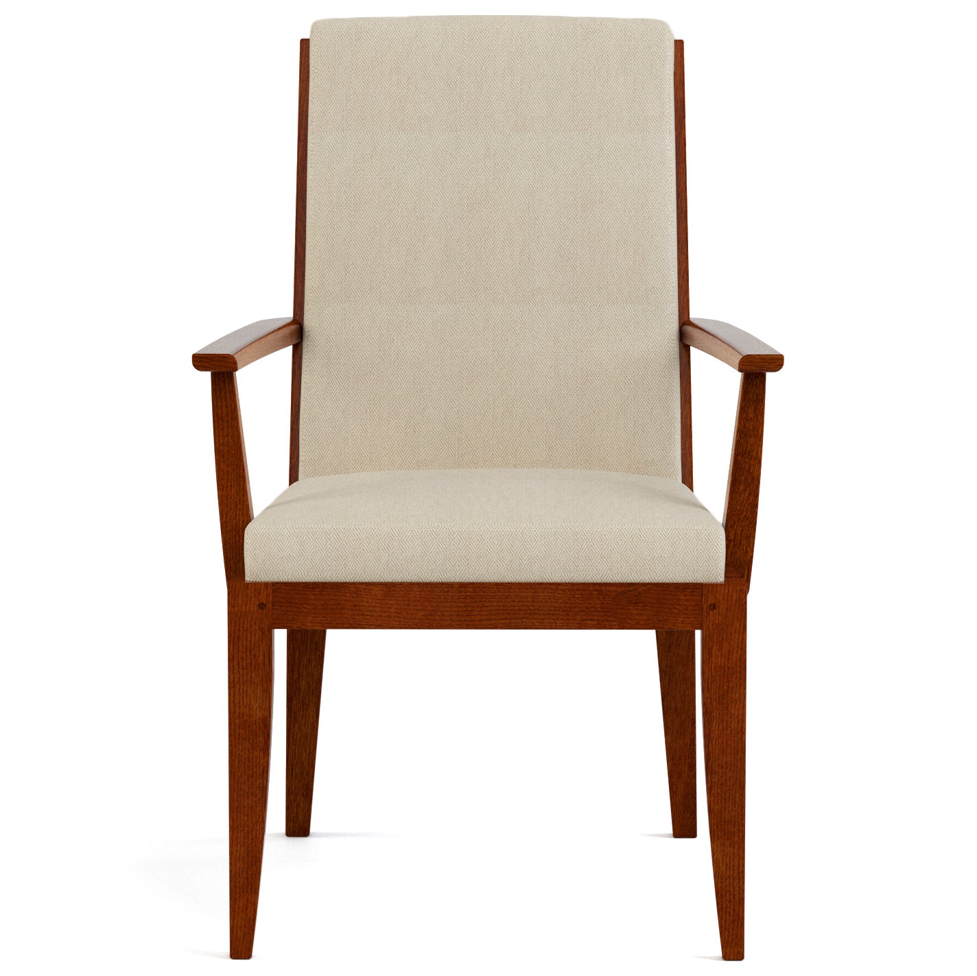 Nommées d'après l'île écossaise magique, nos chaises de salle à manger Skye rembourrées offrent à la collection Highlands une nouvelle option d'assise charmante. Leur élégant dossier emprunte ses détails ajourés à la table à tréteaux Highlands, inspirée de Charles Rennie Mackintosh, tandis que l'assise et le dossier rembourrés offrent confort et style épuré. La structure de la chaise à accoudoirs est dotée de pieds légèrement fuselés et d'accoudoirs profilés. Elle est disponible en chêne ou en cerisier, avec un revêtement en tissu ou cuir Stickley de qualité supérieure.
