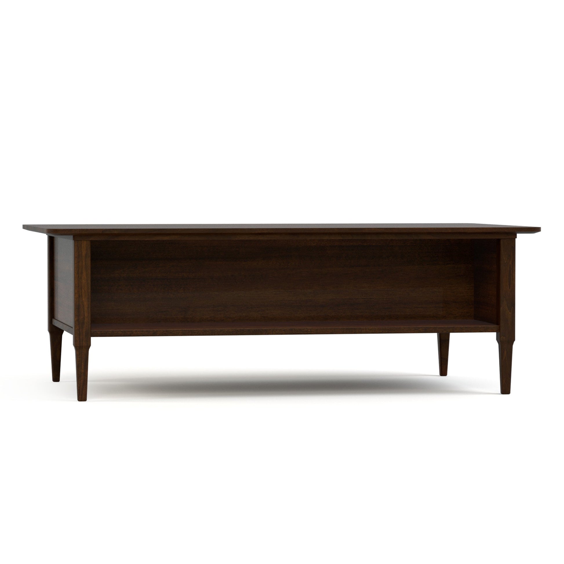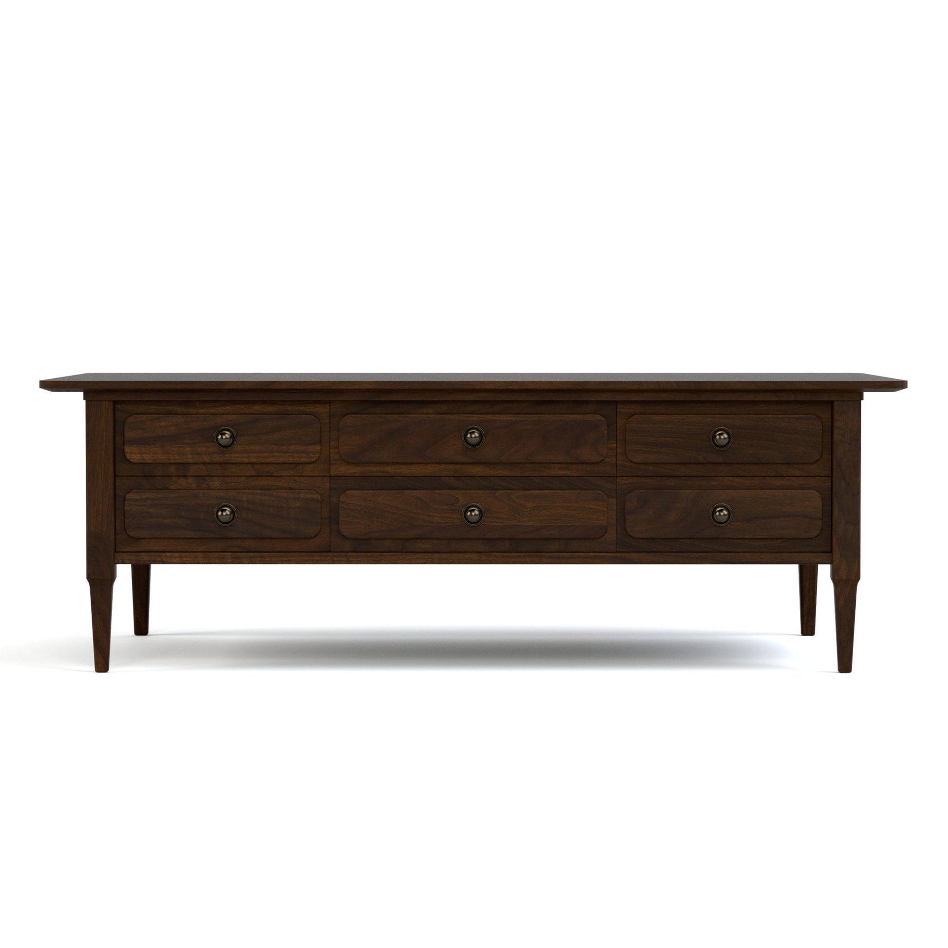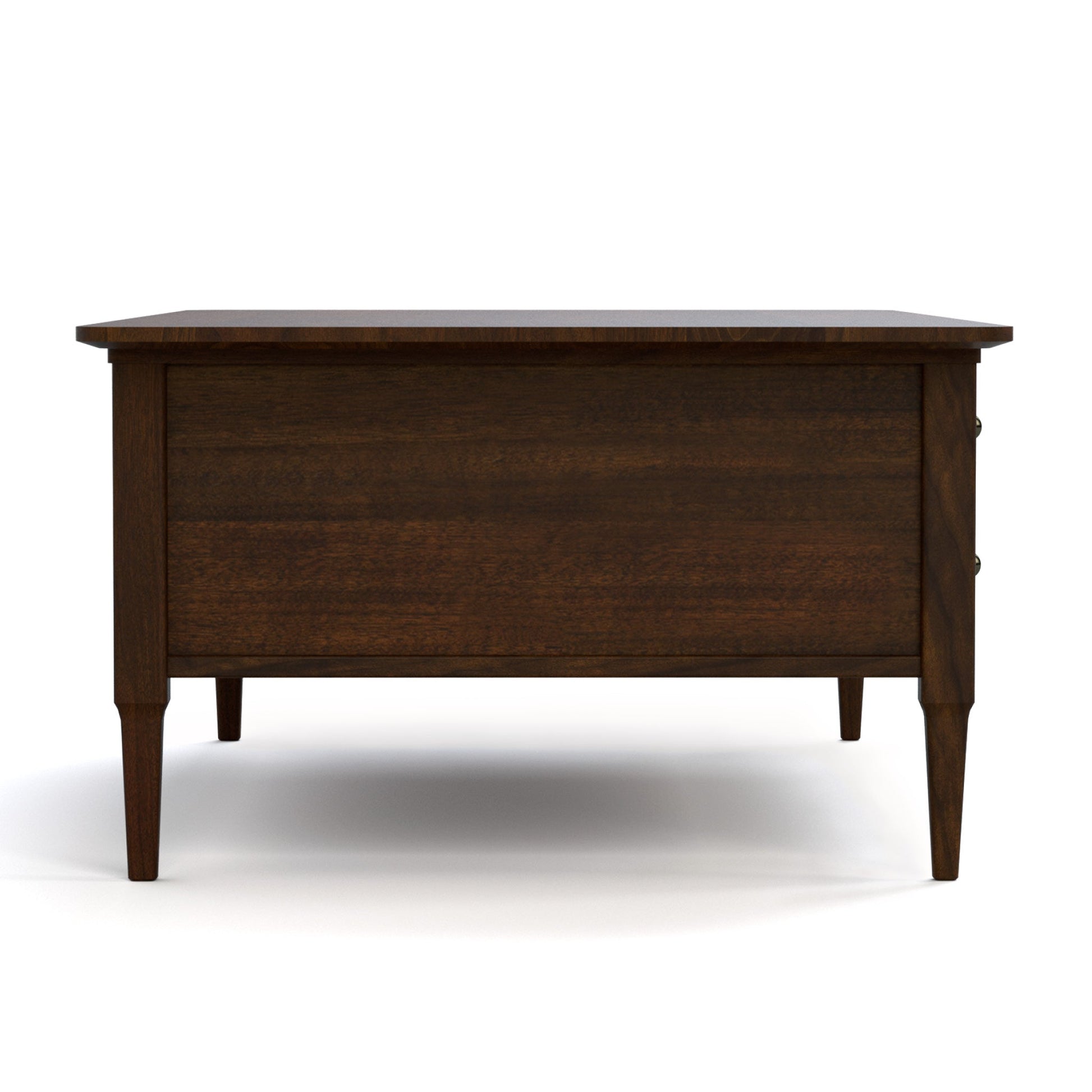 La table basse Hudson Valley offre de nombreux rangements. À l'avant, deux tiroirs peu profonds sont superposés au centre, et deux tiroirs profonds (avec de fausses façades doubles) sont disposés de chaque côté. L'arrière de la table offre un grand espace ouvert pour exposer des livres ou des objets de décoration. Fabriquée en noyer noir américain massif finition Dark Roast, cette élégante pièce présente un large plateau en porte-à-faux, des montants fuselés et des poignées en métal gris fer.