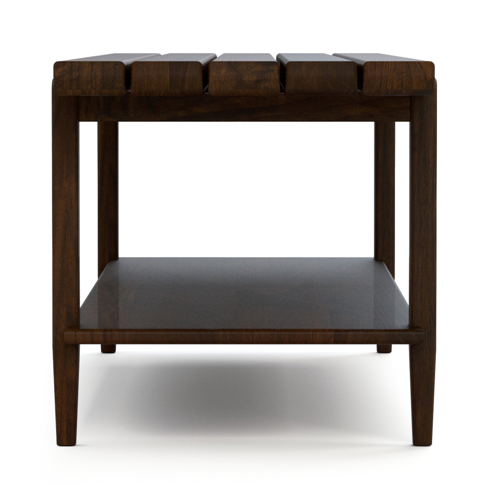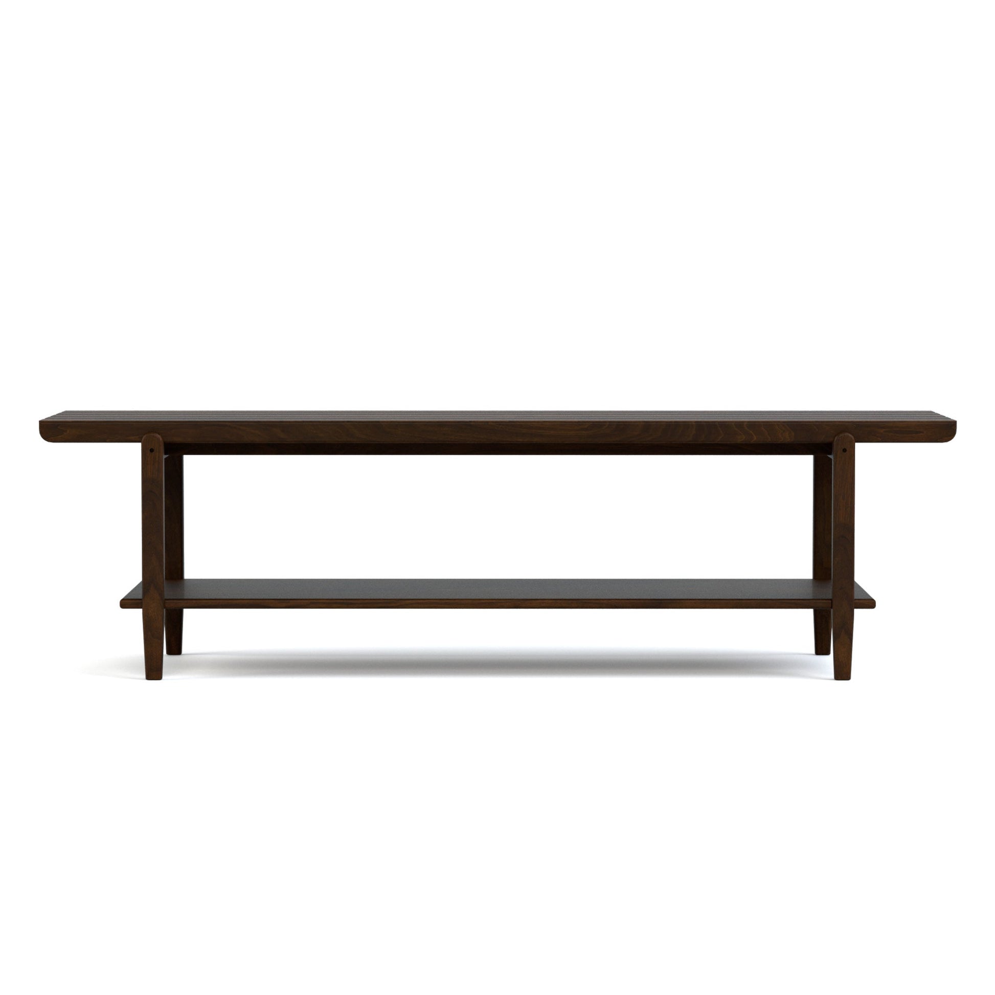 L'assise large de ce banc en noyer massif est formée de cinq longues lattes lisses aux extrémités arrondies. Modernisant encore davantage l'aspect du meuble, ses montants carrés aux bords adoucis et ornés de broches métalliques s'effilent au contact du sol, tandis qu'une tablette inférieure fixe semble flotter entre les pieds.