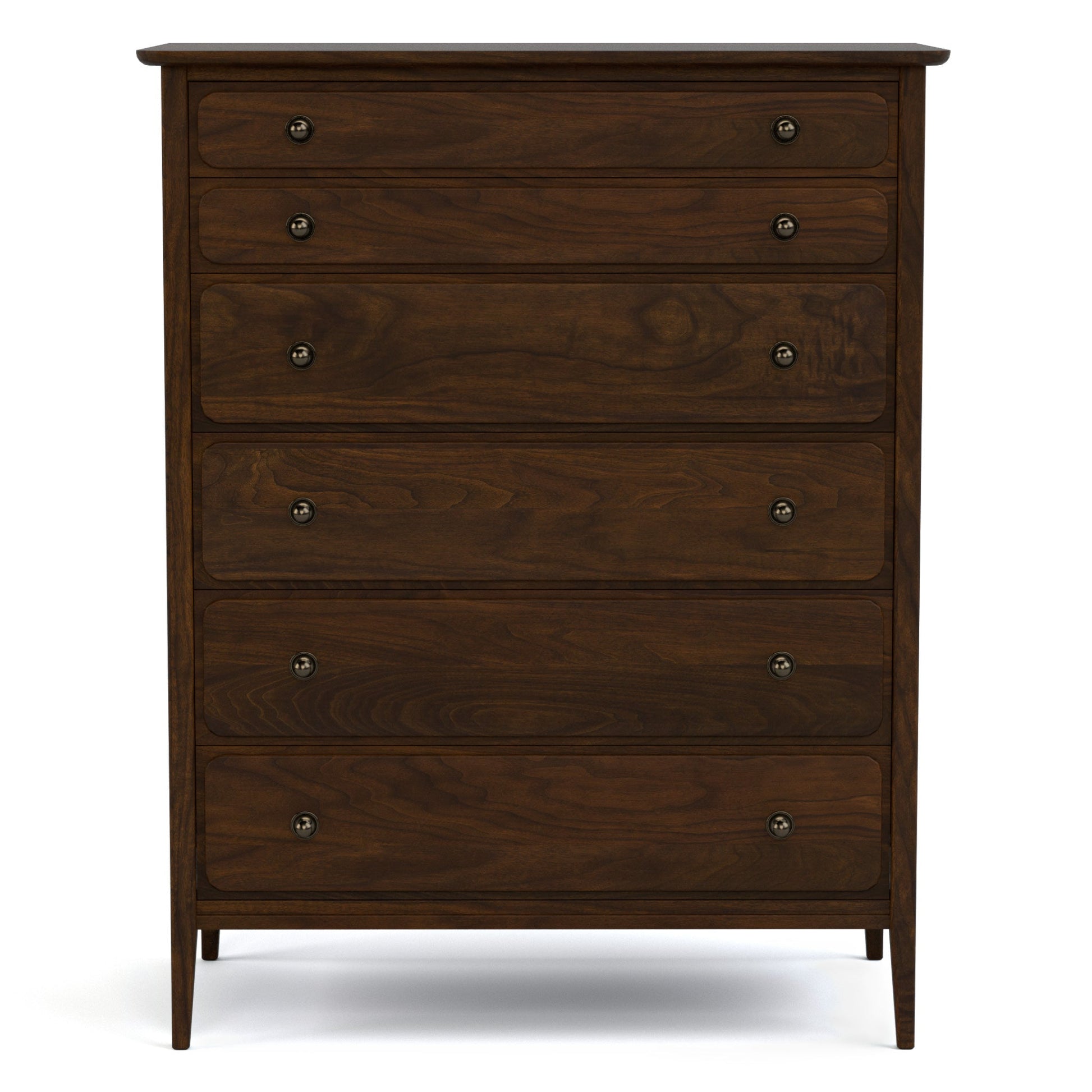 Affichant des lignes épurées et contemporaines, la commode haute en noyer massif offre un vaste espace de rangement grâce à son style d'inspiration américaine et sa finition Dark Roast, typiques de Hudson Valley. Un tiroir supérieur double face est doté d'une séparation centrale et d'un plateau amovible à compartiments multiples avec fond en cuir. Tous les meubles de rangement Hudson Valley partagent un dessus lisse et arrondi, ainsi qu'une face de tiroir arrondie distinctive qui crée l'illusion d'un tiroir entièrement superposé. De jolies poignées métalliques gris fer complètent l'ensemble.