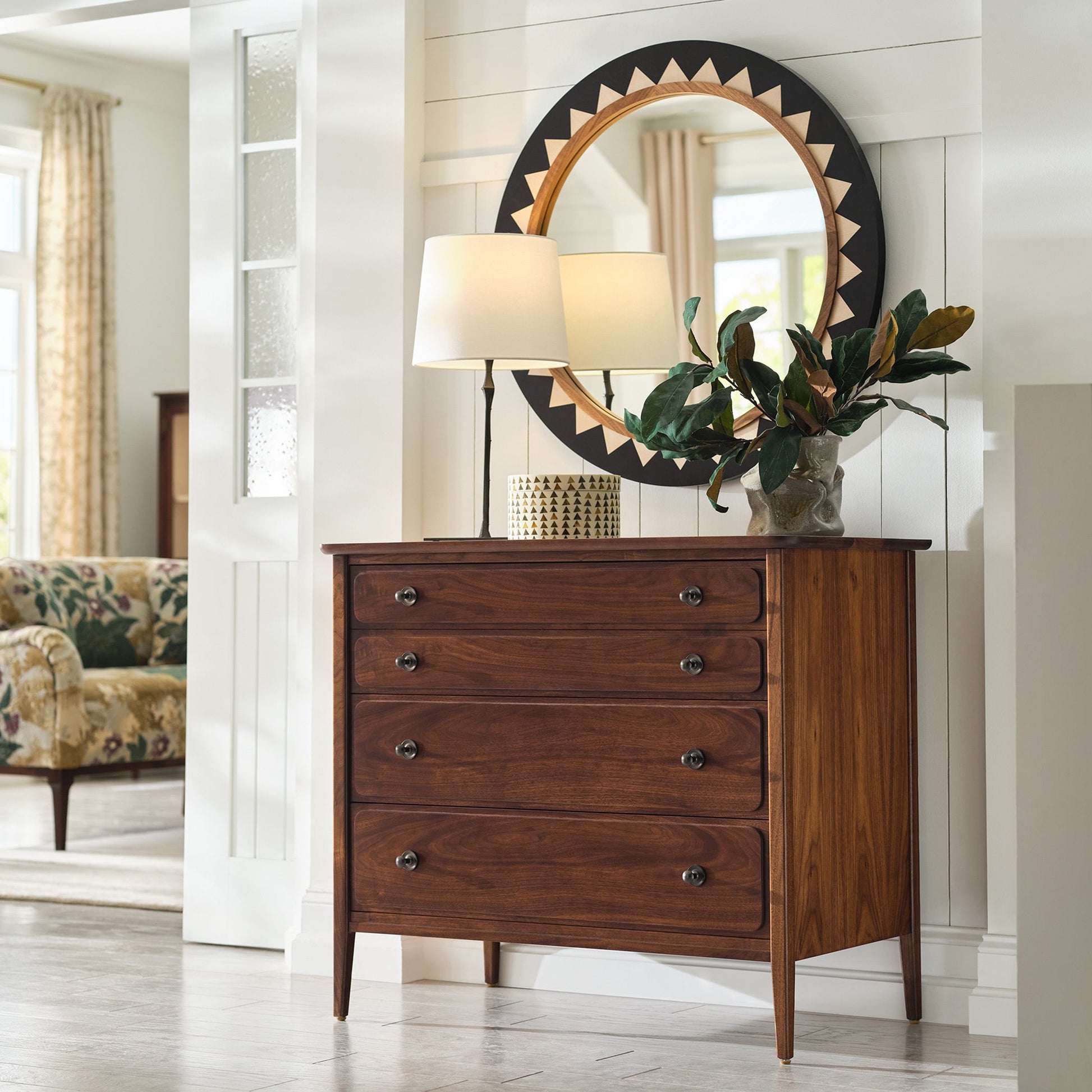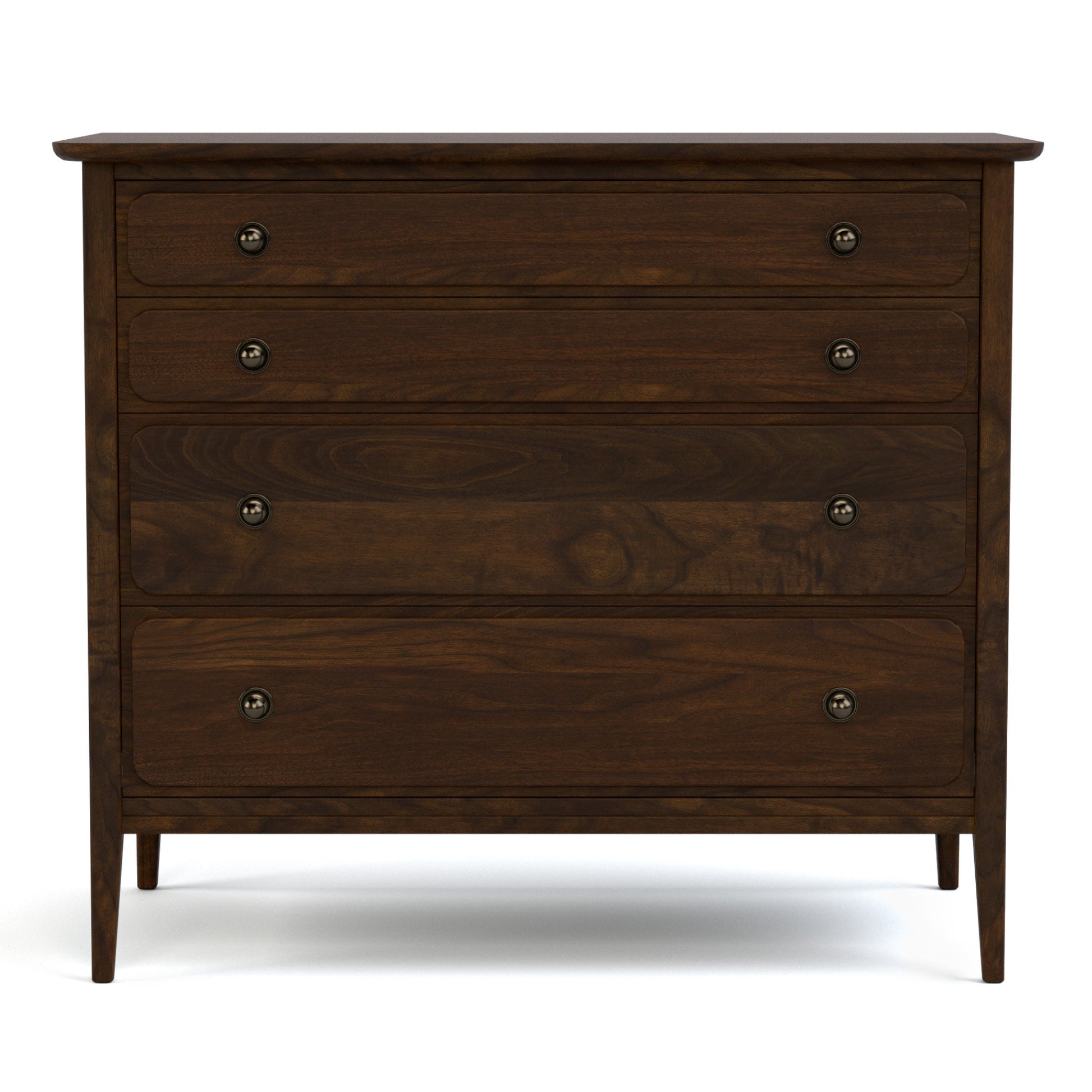 La commode trois tiroirs en noyer massif offre un espace de rangement attrayant grâce à son style d'inspiration américaine et sa finition Dark Roast, typiques de Hudson Valley. Le tiroir supérieur double face est doté d'une séparation centrale et d'un plateau amovible à compartiments multiples avec fond en cuir. Tous les meubles de rangement Hudson Valley partagent un dessus lisse et arrondi, ainsi qu'une face arrondie distinctive qui crée l'illusion d'un tiroir entièrement superposé. De jolies poignées métalliques gris fer complètent l'ensemble.