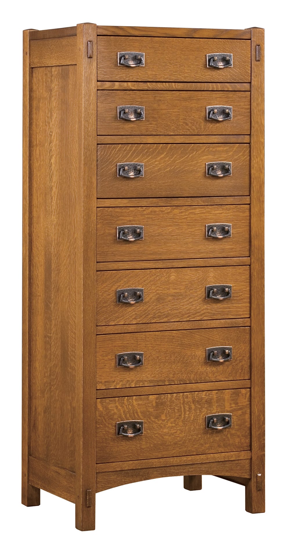 Sept élégants tiroirs gradués composent ce meuble de rangement. Quincaillerie en cuivre foncé. Disponible en chêne massif.