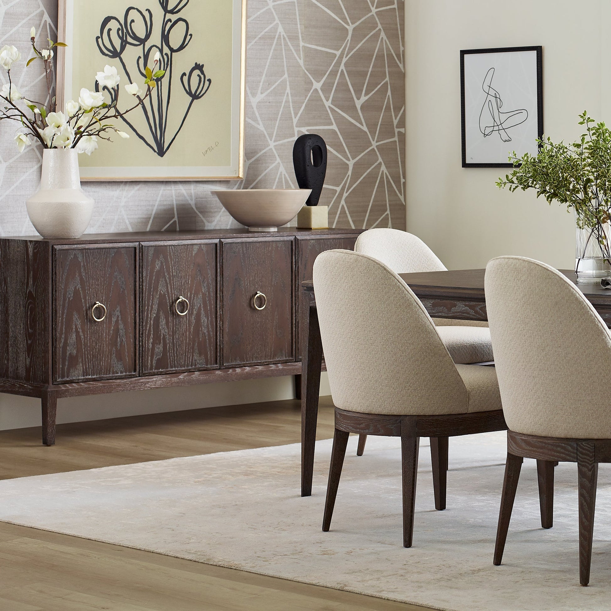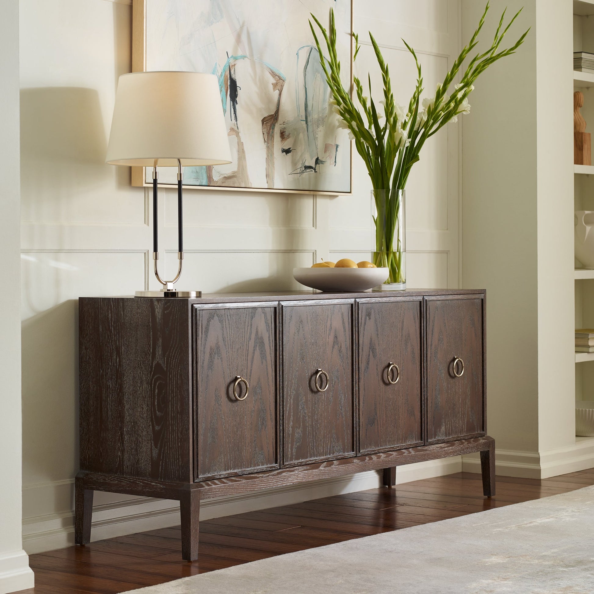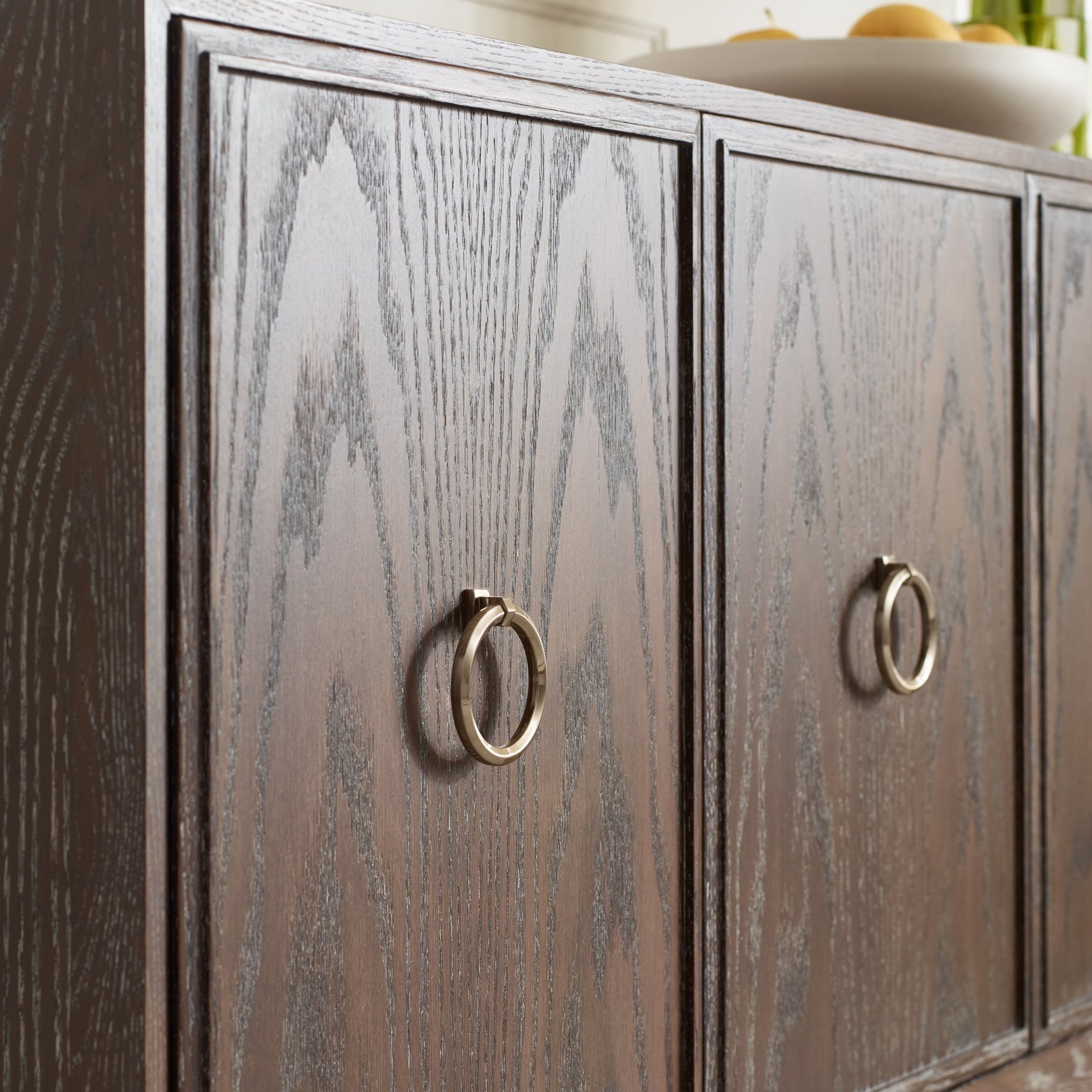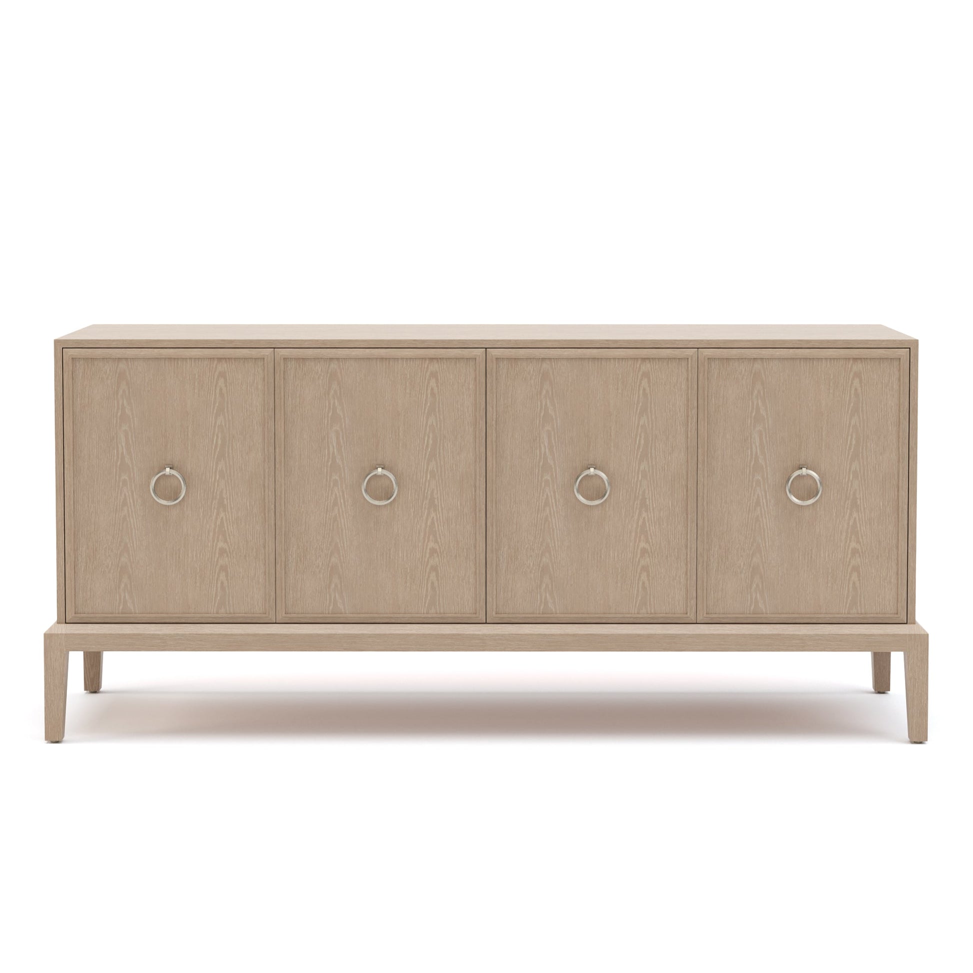 Sur la magnifique desserte quatre portes, les veinures du chêne rouge se fondent harmonieusement sur les portes grâce à des placages à assemblage par glissement. Derrière chaque porte se trouve un tiroir latéral à guidage central, avec doublure argentée et étagère réglable. Le meuble repose sur une base biseautée aux pieds légèrement fuselés, et des poignées en nickel brillant apportent la touche finale. Chêne rouge massif, finition Pier ou Sandbank au choix.