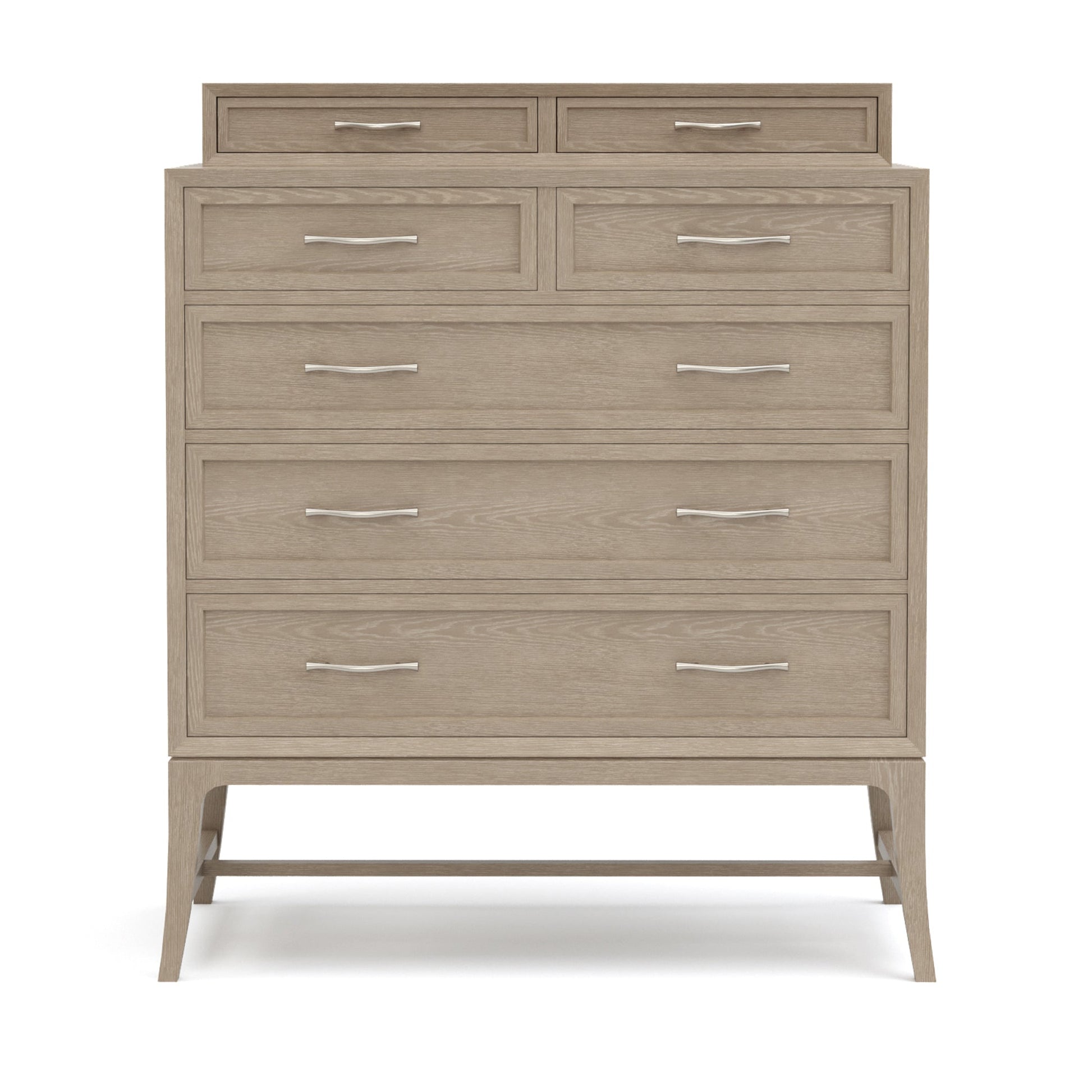 La commode haute Maidstone repose délicatement sur de hauts et fins pieds sabres. Au-dessus de cette base aérienne, un large caisson à tiroirs encadré surplombe un léger creux. Cinq tiroirs suspendus latéraux, guidés au centre et dotés de poignées branches en nickel chaleureux, offrent un espace de rangement spacieux. Une galerie de 11,4 cm sur le dessus ajoute deux tiroirs en retrait, doublés de velours, ainsi qu'un plateau à bijoux. Chêne rouge massif, finition Pier ou Sandbank au choix.
