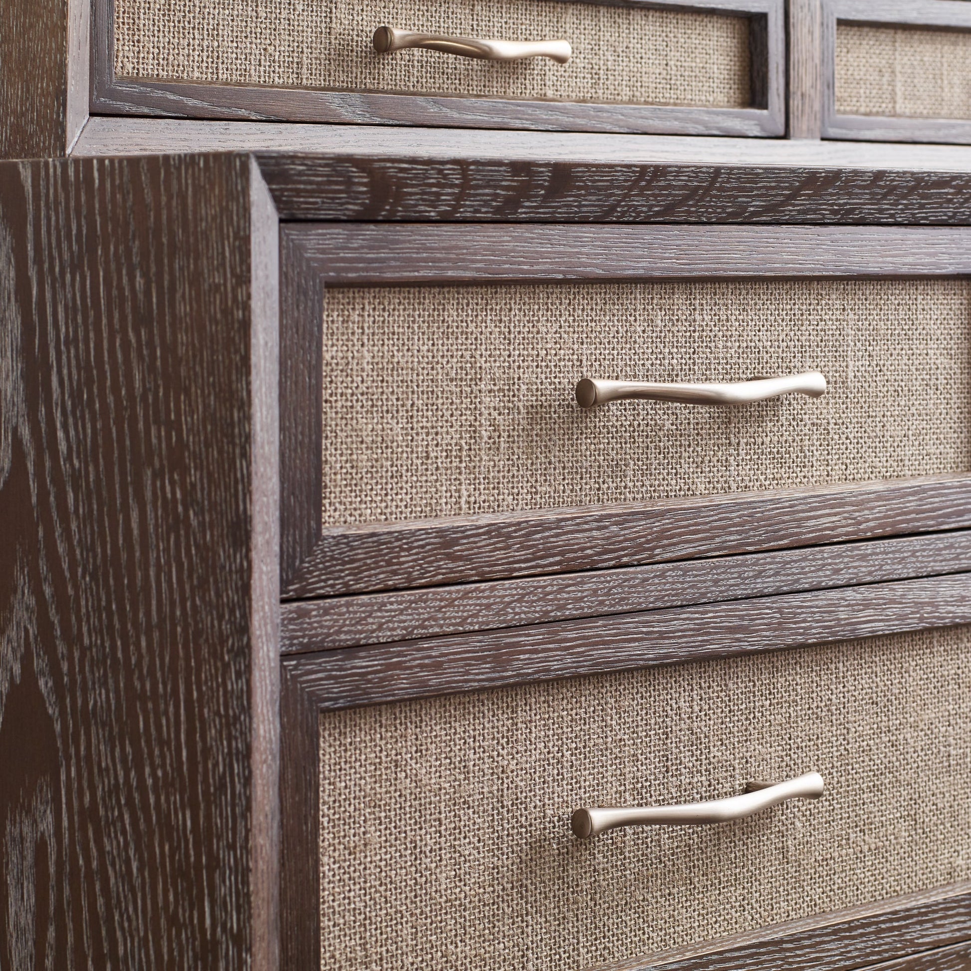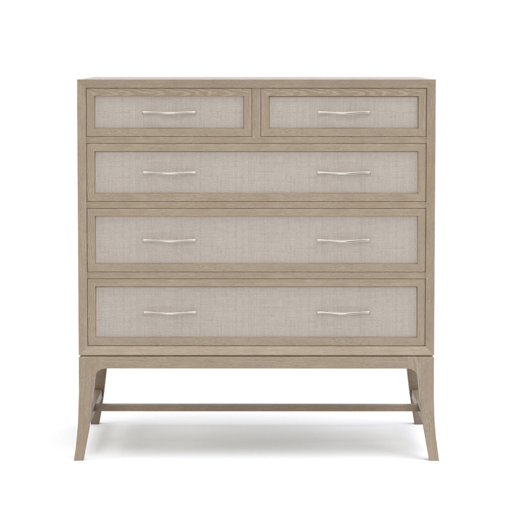 La commode haute Maidstone repose délicatement sur des pieds sabre hauts et fins. Au-dessus de cette base aérienne, un large caisson à tiroirs encadré surplombe un léger creux. Cinq tiroirs suspendus latéraux, guidés au centre, avec façades en jute tressée et poignées branches en nickel chaleureux, offrent un espace de rangement spacieux. Chêne rouge massif, finition Pier ou Sandbank au choix.