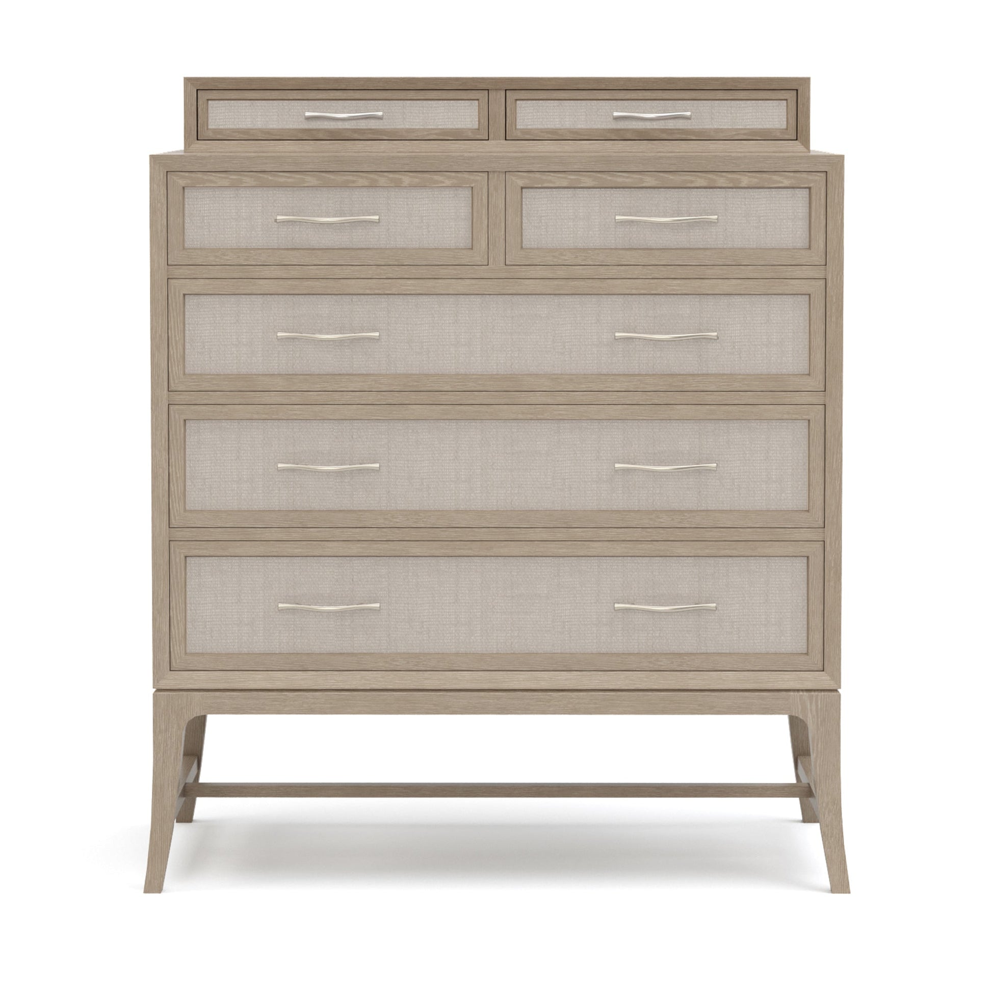 La commode haute Maidstone repose délicatement sur de hauts et fins pieds sabres. Au-dessus de cette base aérienne, un large caisson à tiroirs encadré surplombe un léger creux. Cinq tiroirs suspendus latéraux, guidés au centre, avec façades en jute tressée et poignées branches en nickel chaleureux, offrent un espace de rangement spacieux. Une galerie de 11,4 cm sur le dessus ajoute deux tiroirs en retrait, doublés de velours, ainsi qu'un plateau à bijoux. Chêne rouge massif, finition Pier ou Sandbank au choix.