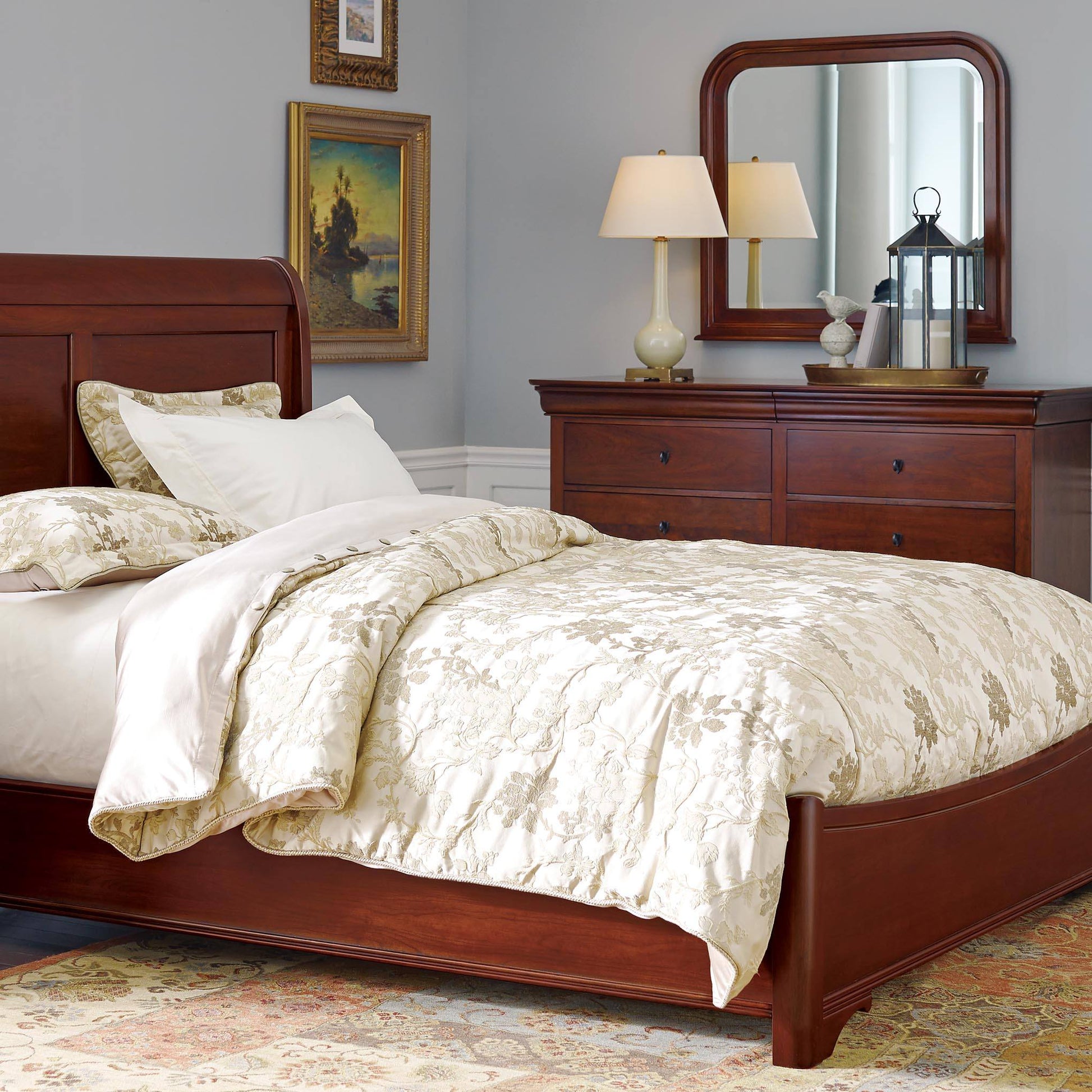 Cette superbe commode à six tiroirs, avec poignées à fausses clés et pieds à équerre, offre un espace de rangement spacieux. Deux tiroirs dissimulés au-dessus sont recouverts de velours. Merisier massif.