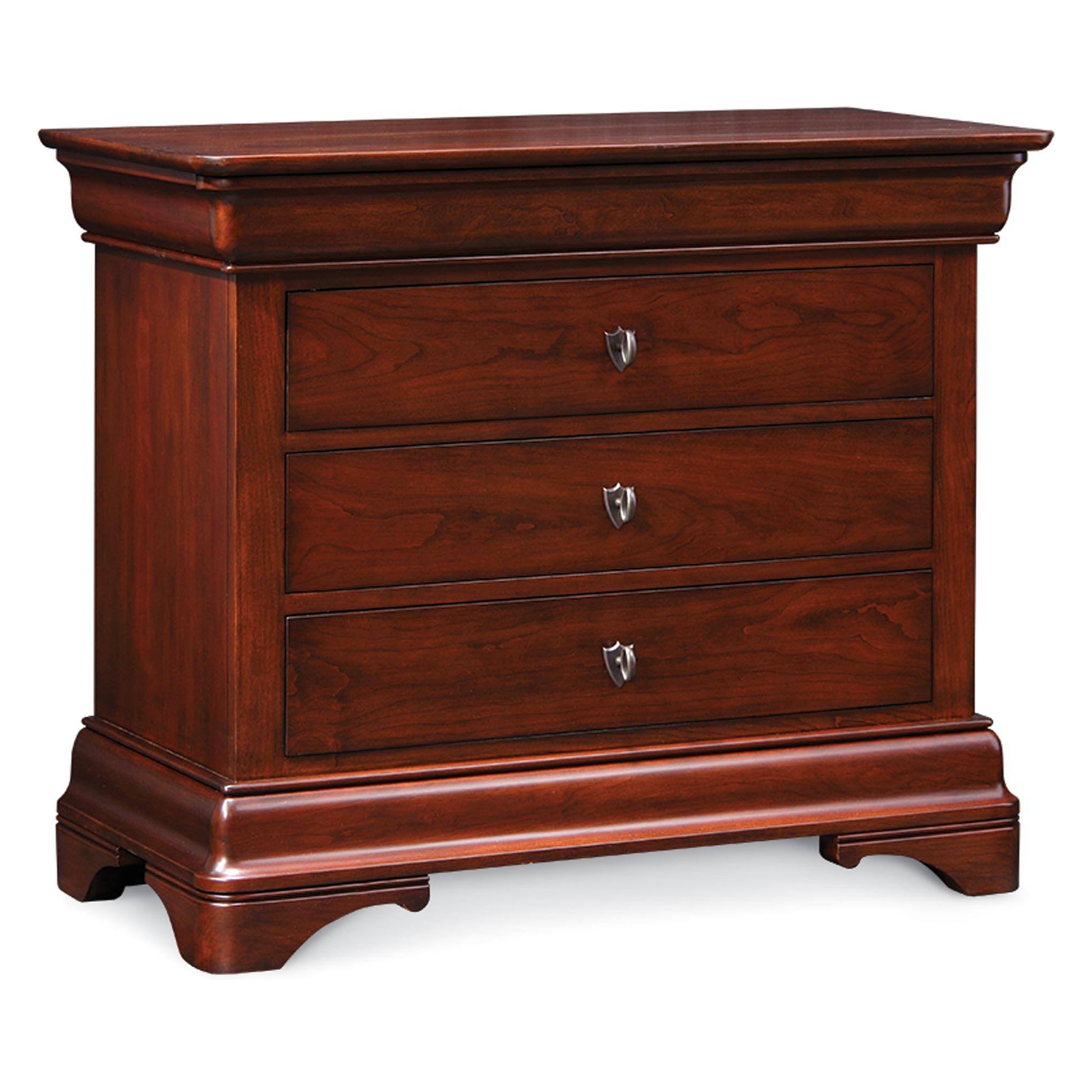 Cette exquise table de chevet comprend trois tiroirs avec fausses poignées à clé. Un tiroir, doublé de velours, est dissimulé derrière la moulure supérieure. Merisier massif.