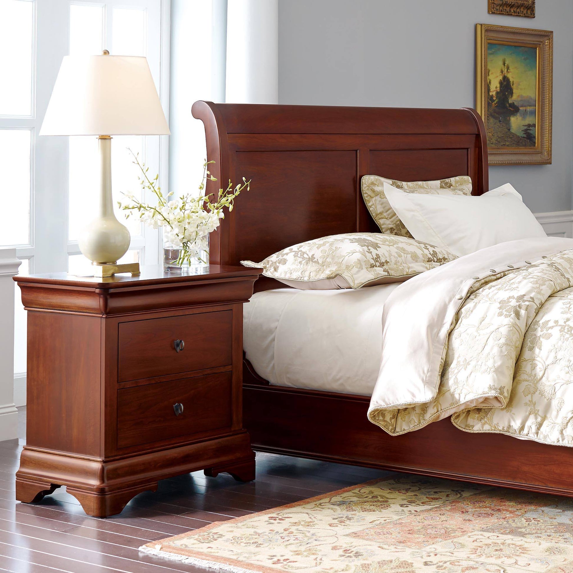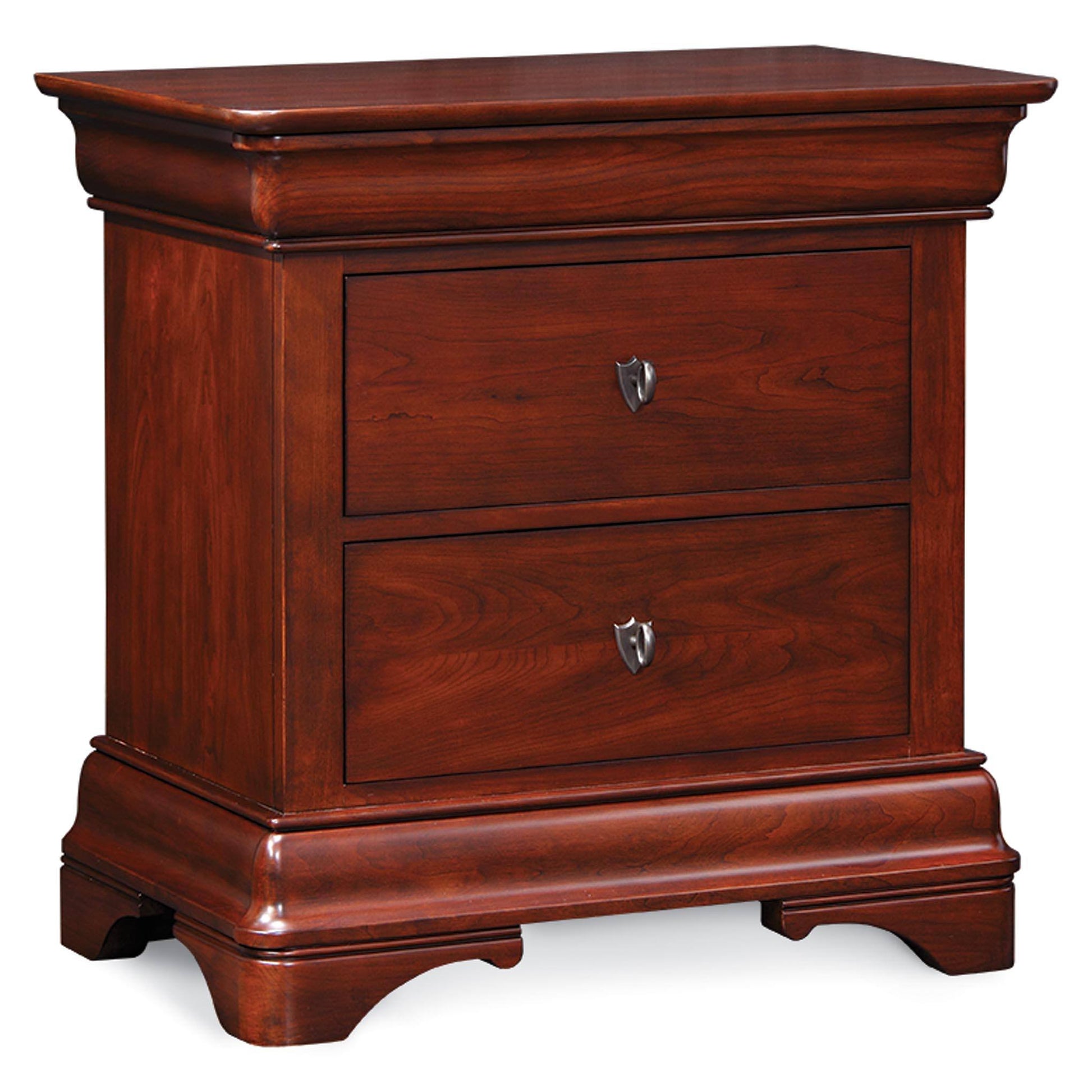 Charmante et sophistiquée, la table de chevet Marseilles à deux tiroirs est dotée de fausses poignées à clé et d'un tiroir dissimulé dans la moulure supérieure, doublé d'un fond de tiroir en velours. Cerisier massif.