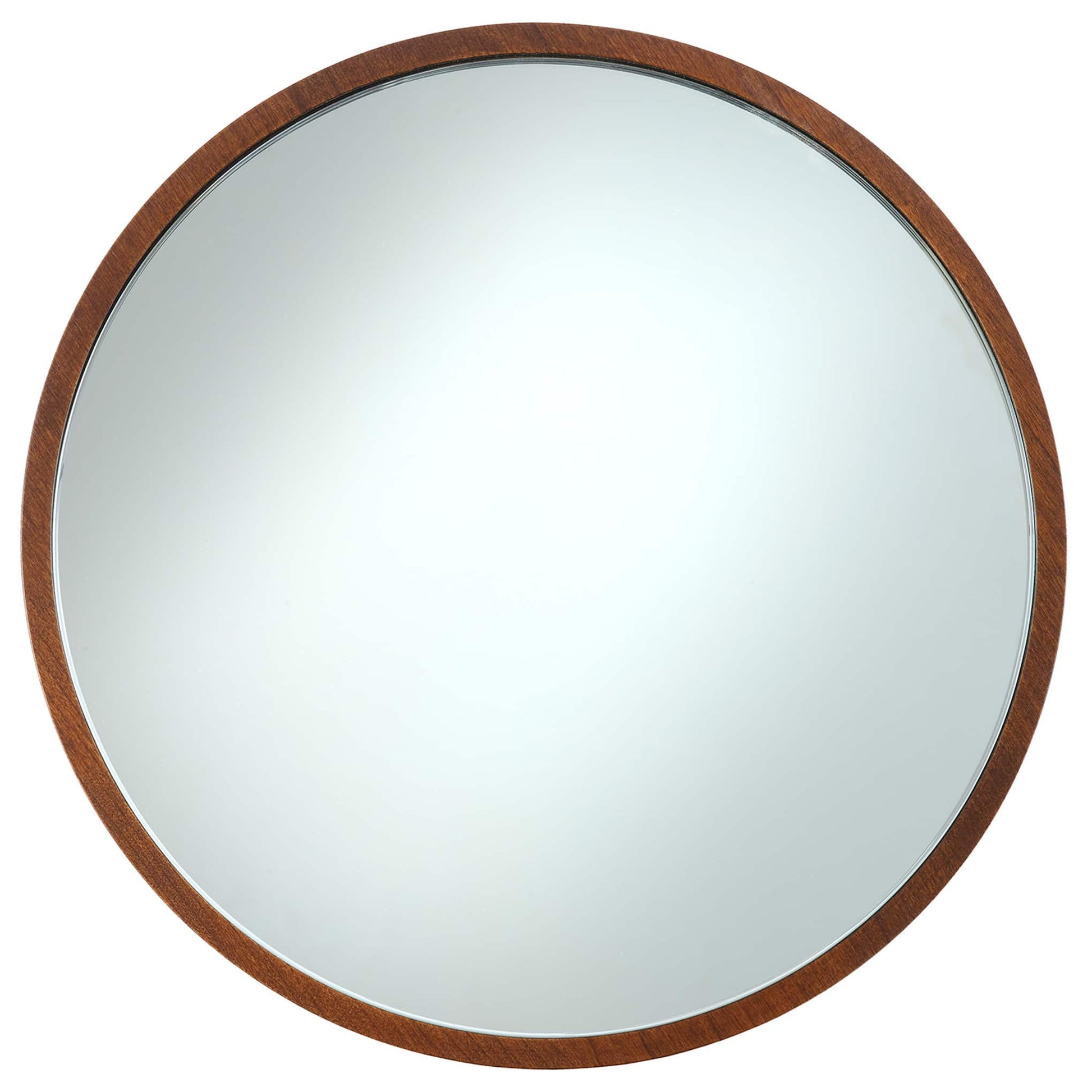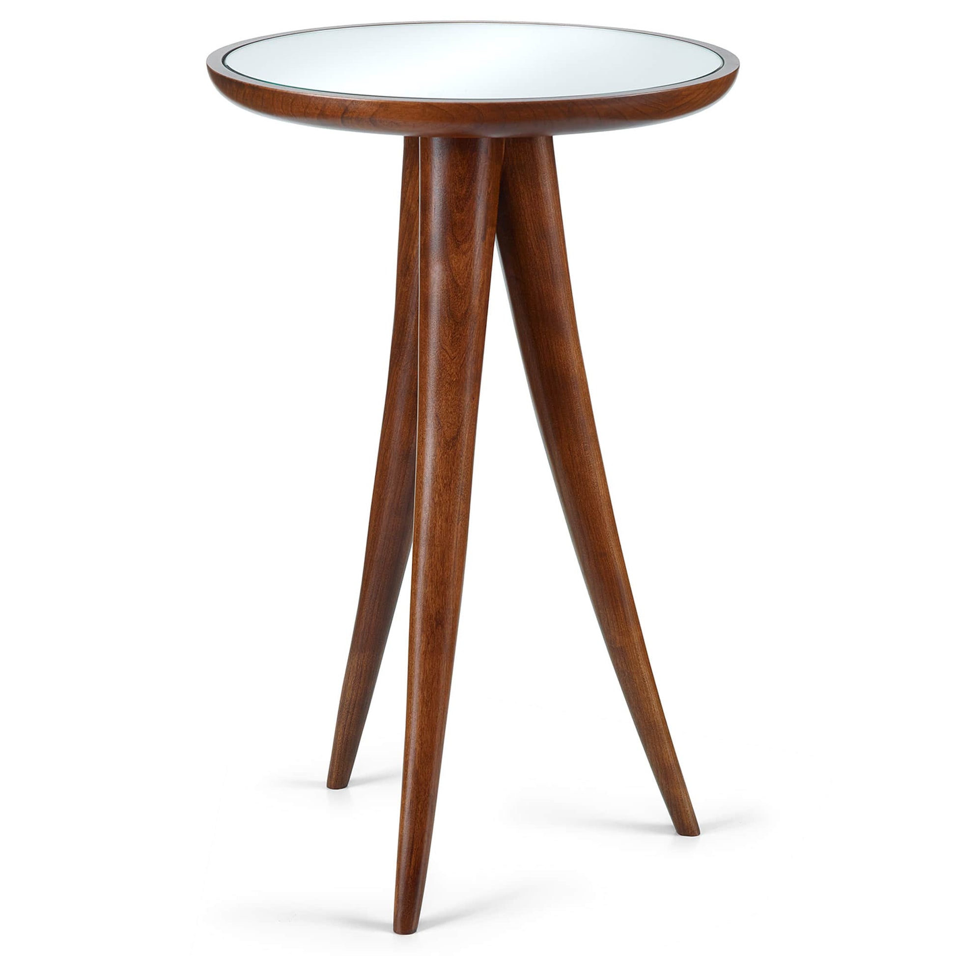 Pour les tables basses Martine, ludiques et inspirées du milieu du siècle, un piétement tripode en merisier massif est formé de trois pieds fins et arrondis aux courbes dynamiques. Le plateau rond accueille un miroir encastré qui reflète joyeusement la lumière de la pièce.