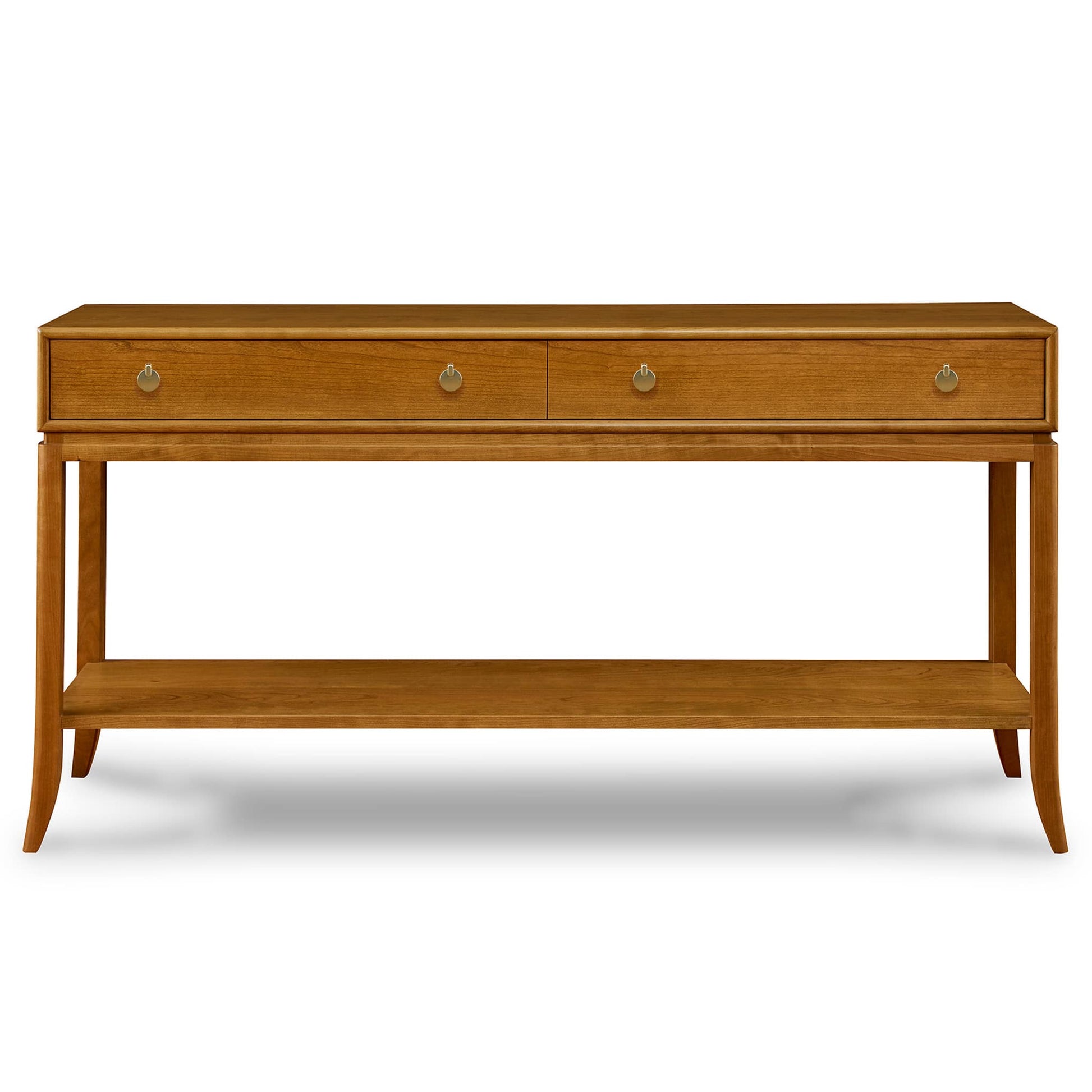 Dans le groupe d'appoint tout en merisier de Martine, d'inspiration milieu de siècle, les moulures encadrent les façades des tiroirs légèrement encastrées, et une forme arrondie se prolonge le long des pieds sabre évasés. La console est dotée de deux tiroirs latéraux à guidage central, munis de petites poignées pendantes, ainsi que d'une étagère basse. Une option est également disponible avec les façades des tiroirs peintes en crème épaisse.