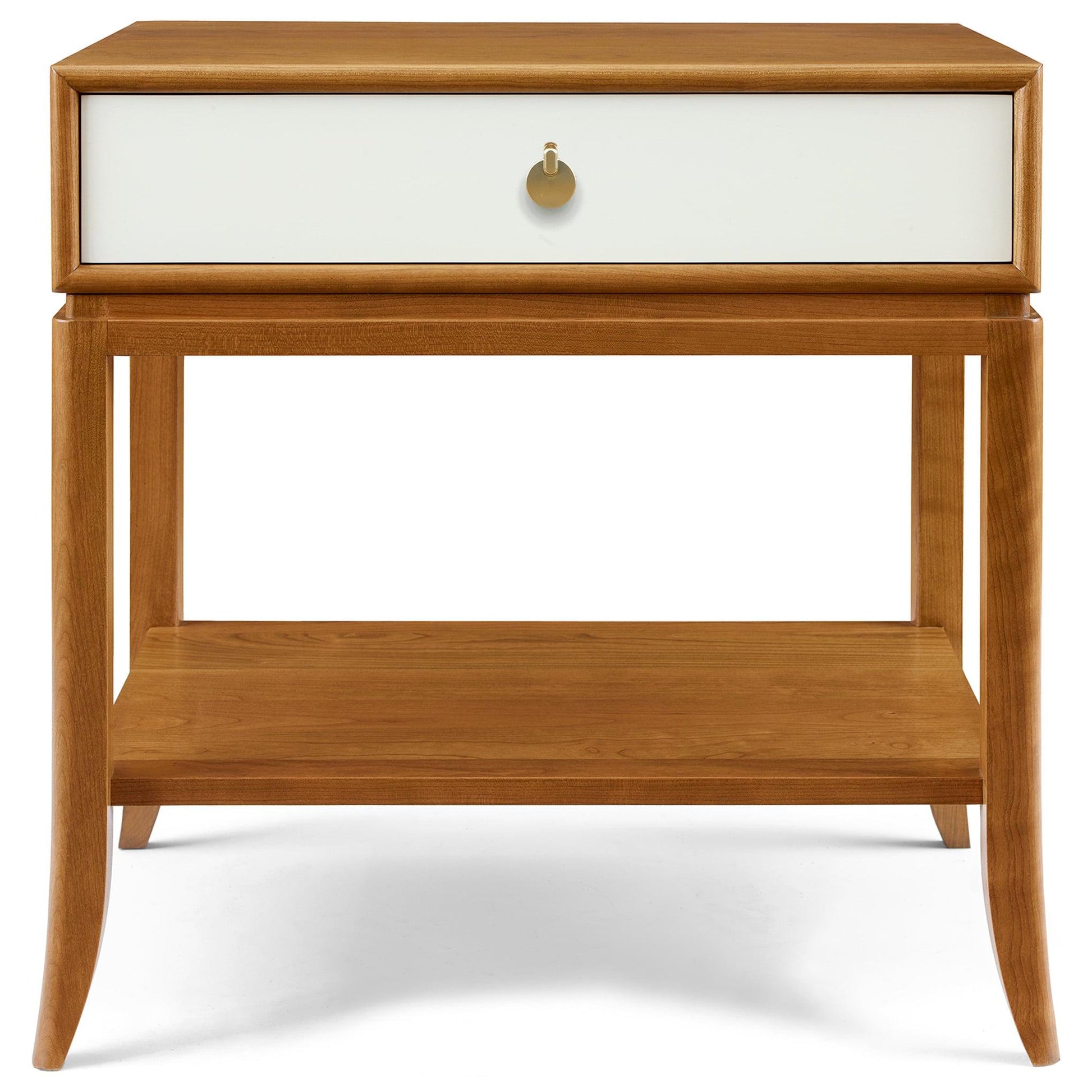 Dans le groupe d'appoint tout en merisier de Martine, inspiré du milieu du siècle, les baguettes encadrent les façades des tiroirs légèrement encastrées, et une forme arrondie se prolonge le long des pieds sabre évasés. La table d'appoint est dotée d'un tiroir latéral à guidage central, d'une petite poignée pendante et d'une étagère basse. Utilisez-la comme table de chevet dans la chambre. Une façade de tiroir peinte en crème épaisse est également disponible.