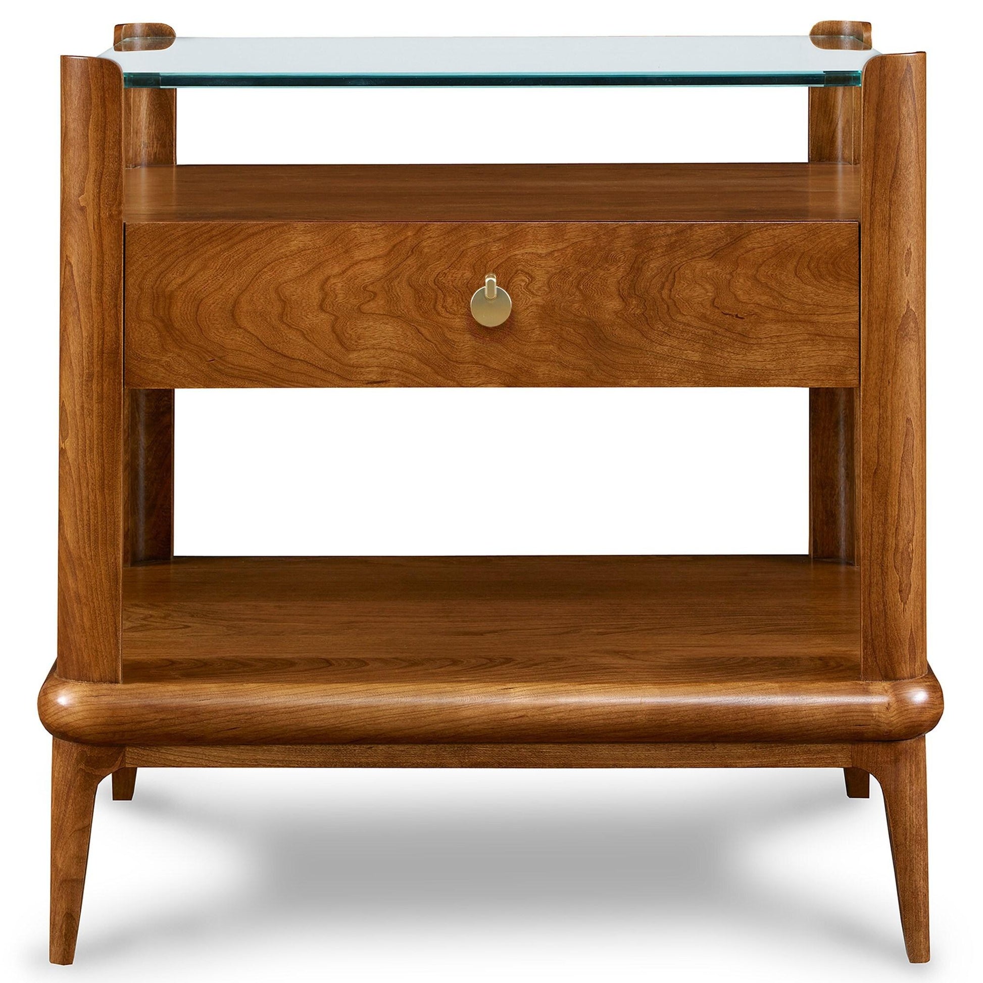 La table de chevet Martine en merisier massif, d'inspiration milieu du XXe siècle, est dotée d'un plateau en verre trempé d'une clarté exceptionnelle, suspendu à des montants incurvés. Son tiroir central suspendu latéralement, faisant office d'étagère, flotte sous le verre et est agrémenté d'une petite poignée pendante.