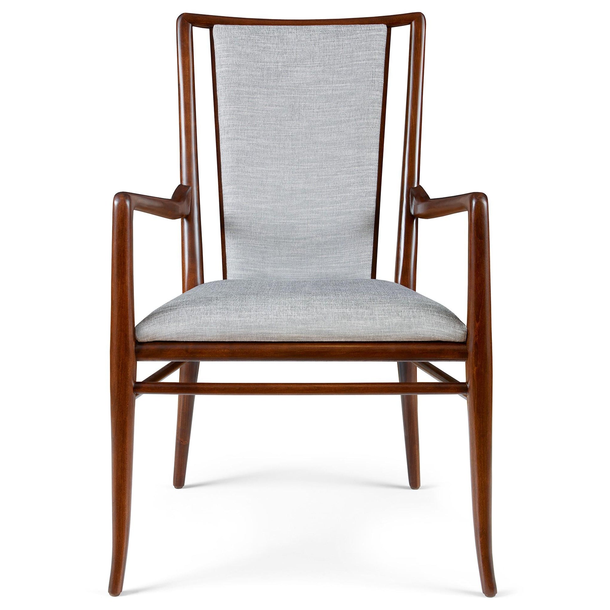 Conçue dans un esprit de confort décontracté et d'inspiration milieu du siècle, la chaise Martine à dossier rembourré présente des pieds légèrement incurvés et arrondis, ainsi qu'un dossier relevé, où un large panneau central rembourré se détache de la structure. Les accoudoirs se prolongent harmonieusement depuis les pieds avant, et des entretoises sur les quatre côtés se trouvent juste sous l'assise rembourrée. Disponible en tissu ou en cuir au choix.