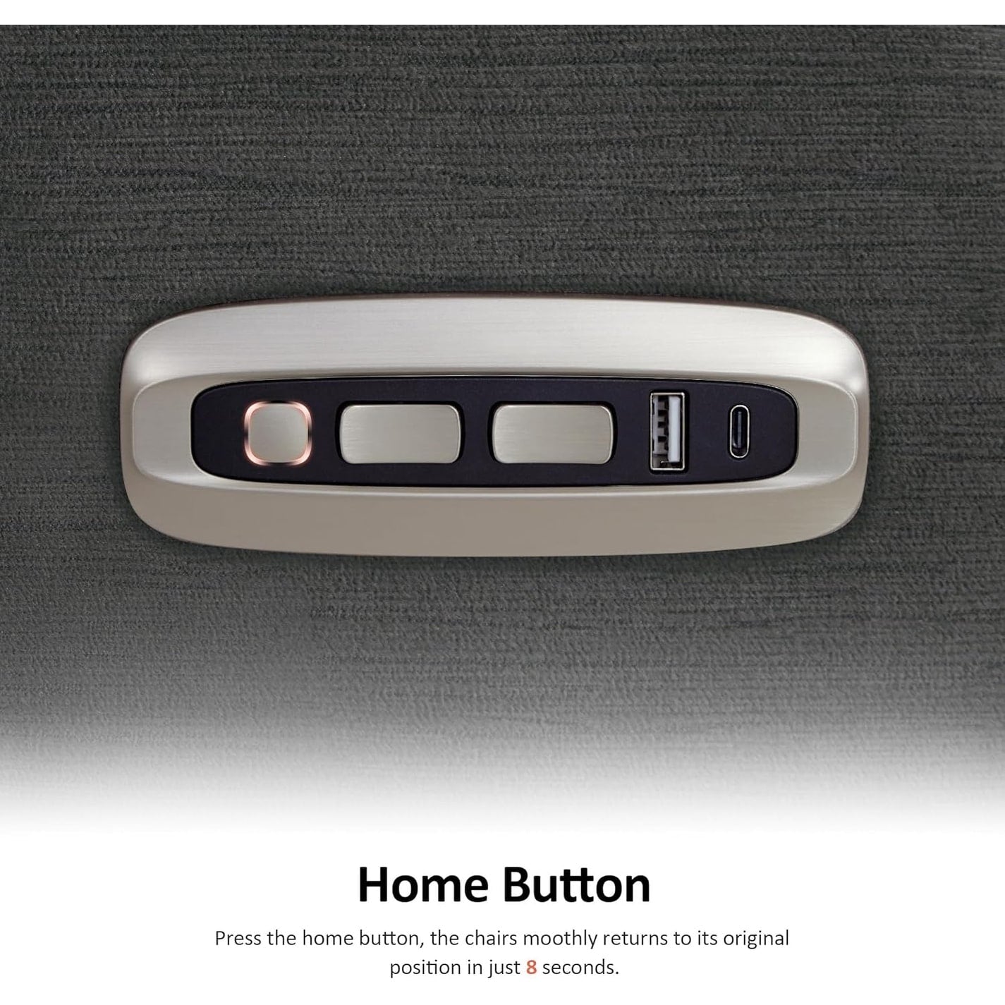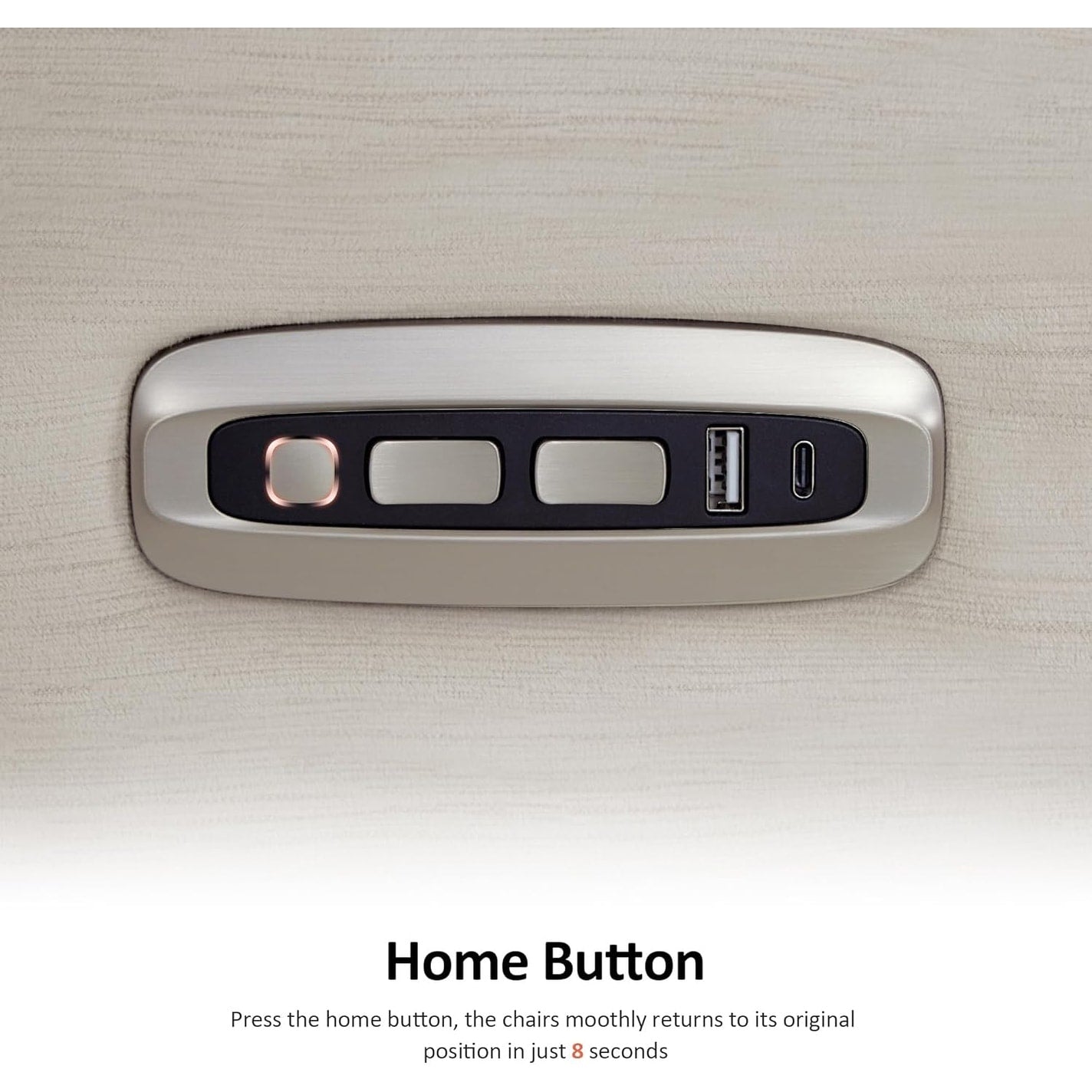 - Manette intuitive. Appuyez sur le bouton d'accueil et le fauteuil revient en douceur à sa position initiale en seulement 8 secondes. Les deux ports de charge USB et Type-C sur l'accoudoir permettent d'utiliser n'importe quel téléphone ou tablette.