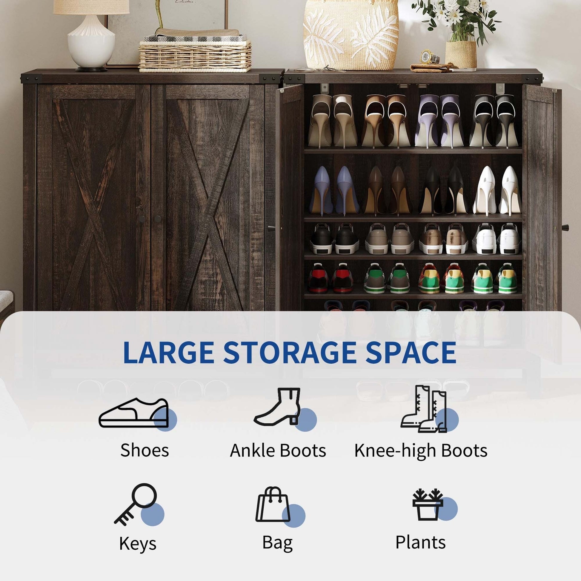 Organisez votre espace avec notre spacieux meuble à chaussures. Avec ses 5 étagères pouvant accueillir 15 à 20 paires de chaussures et son plateau pratique pour les petits objets, il est indispensable à toute maison. Son élégant motif en X lui confère un charme rustique, tandis que ses 1re et 3e étagères réglables accueillent tous types de chaussures. Fabriqué en MDF durable avec des pieds en bois robustes, il est conçu pour une stabilité et une longévité accrues. N'oubliez pas d'installer le kit anti-basculement inclus pour plus de sécurité.
