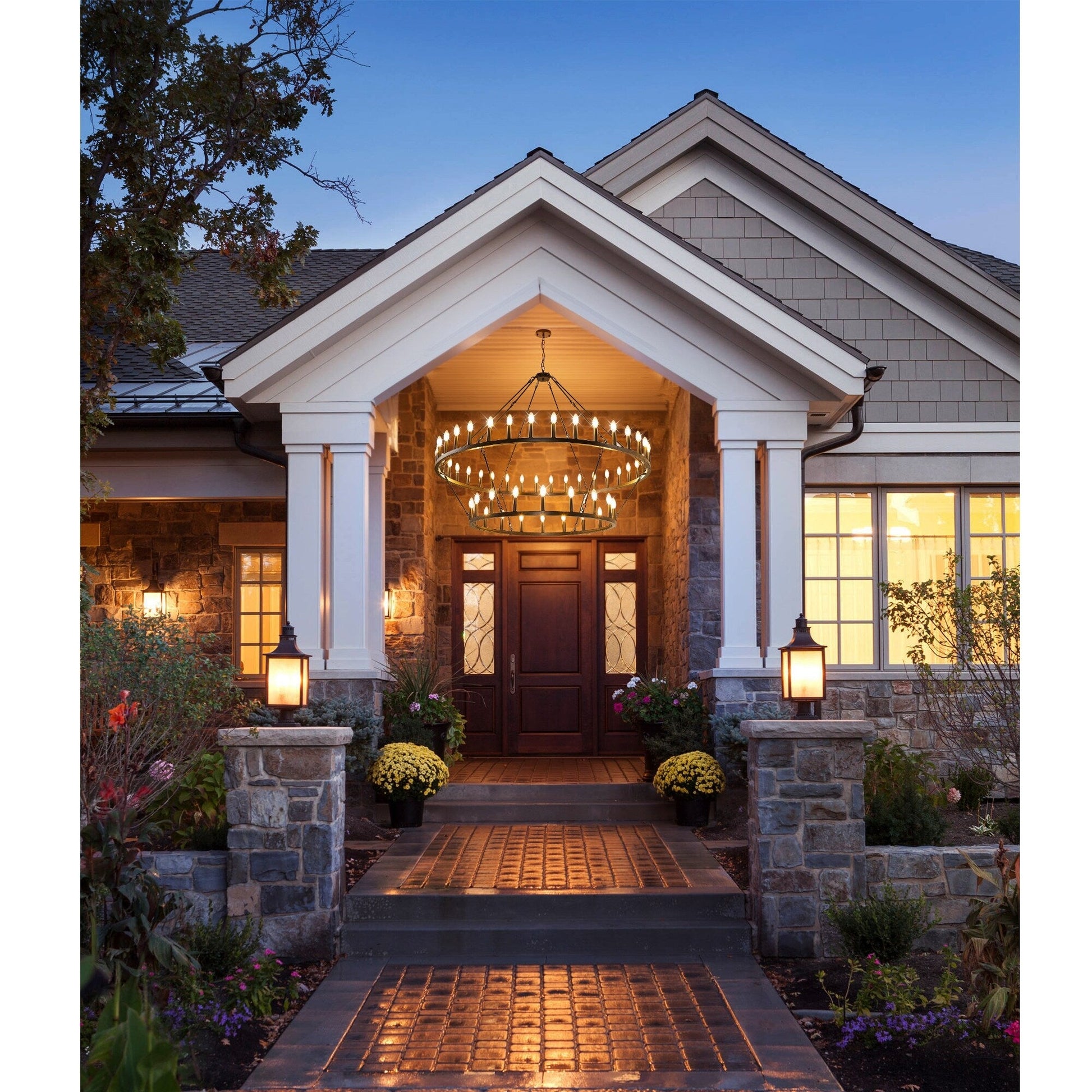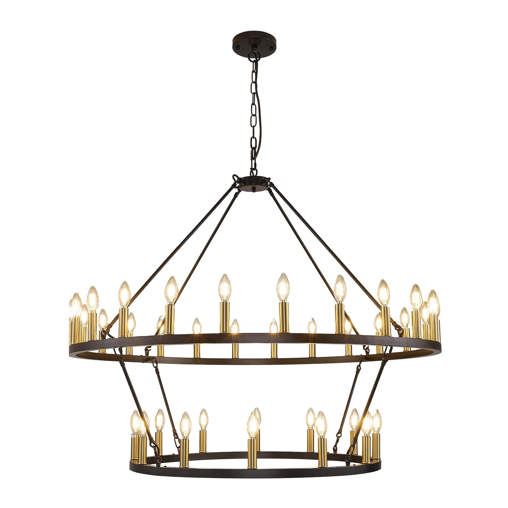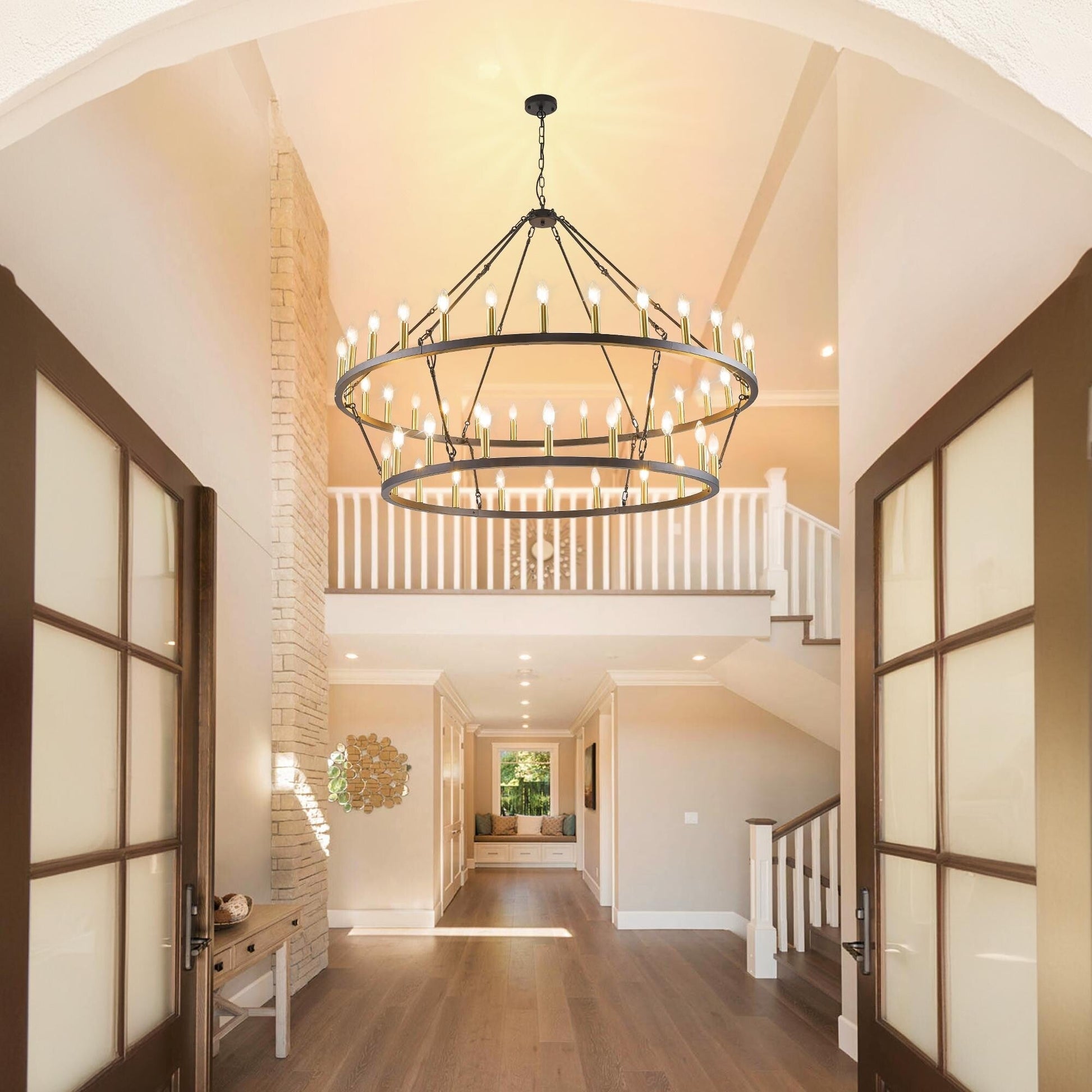 Ajoutez une touche de style campagnard moderne à votre intérieur avec ce grand lustre rond à deux niveaux en forme de roue de chariot. Fabriqué en fer de haute qualité, ce lustre classique est sablé pour une finition mate et durable. Ses 36 lumières réparties sur deux niveaux offrent une couverture lumineuse à 360° et créent une atmosphère chaleureuse. Ce grand lustre est parfait pour éclairer pleinement un grand espace comme un salon, une salle à manger ou un grand hall d'entrée à deux étages.