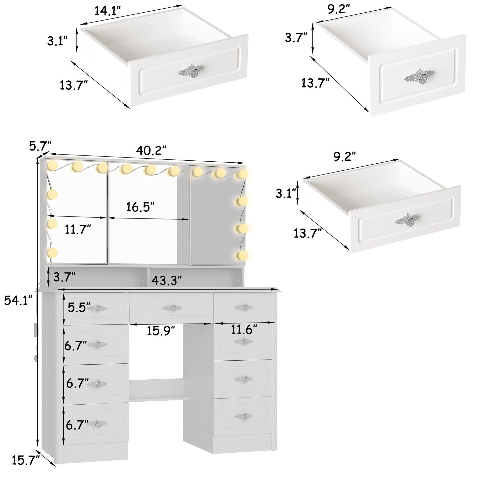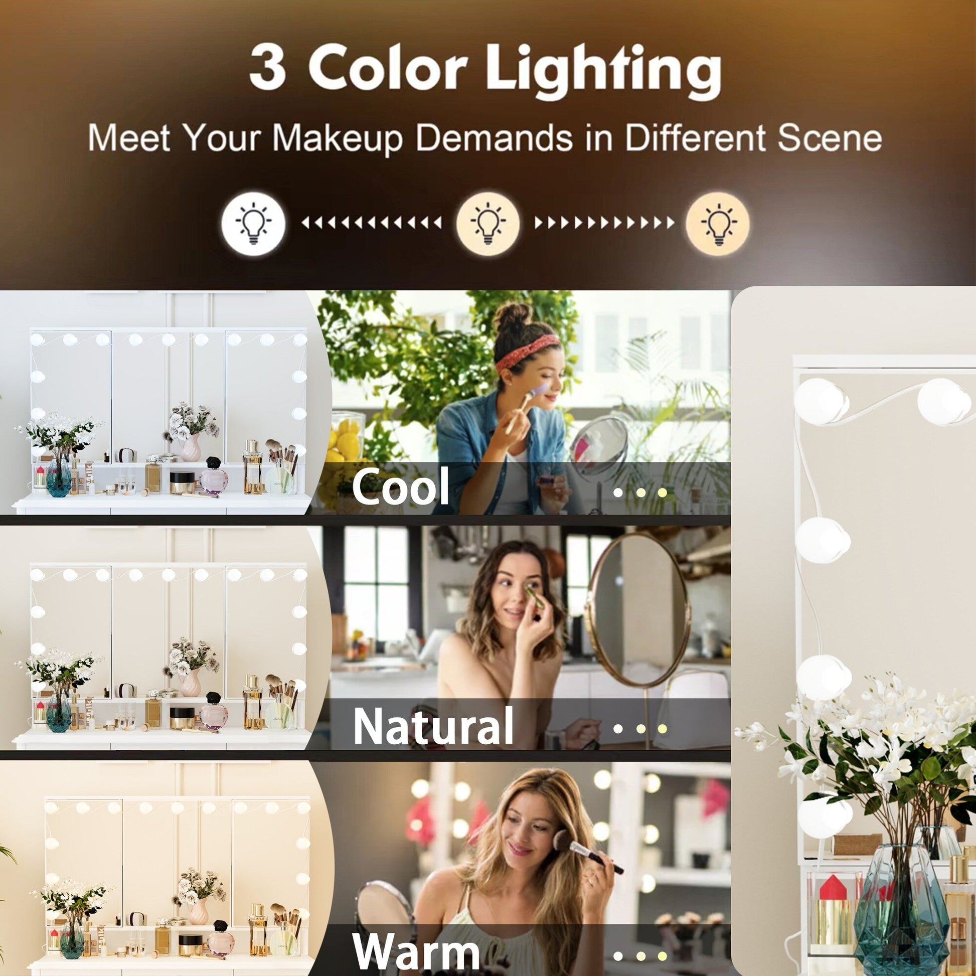 Coiffeuse blanche élégante avec miroir à trois volets et éclairage réglable