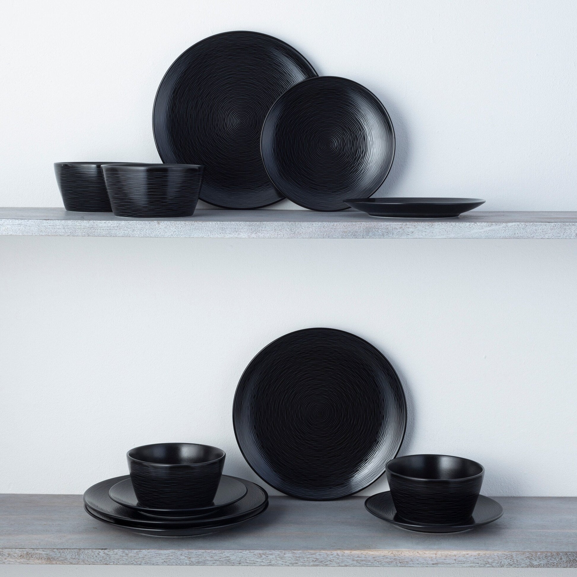 - L'ensemble comprend 4 assiettes plates, 4 assiettes à salade et 4 bols à céréales.