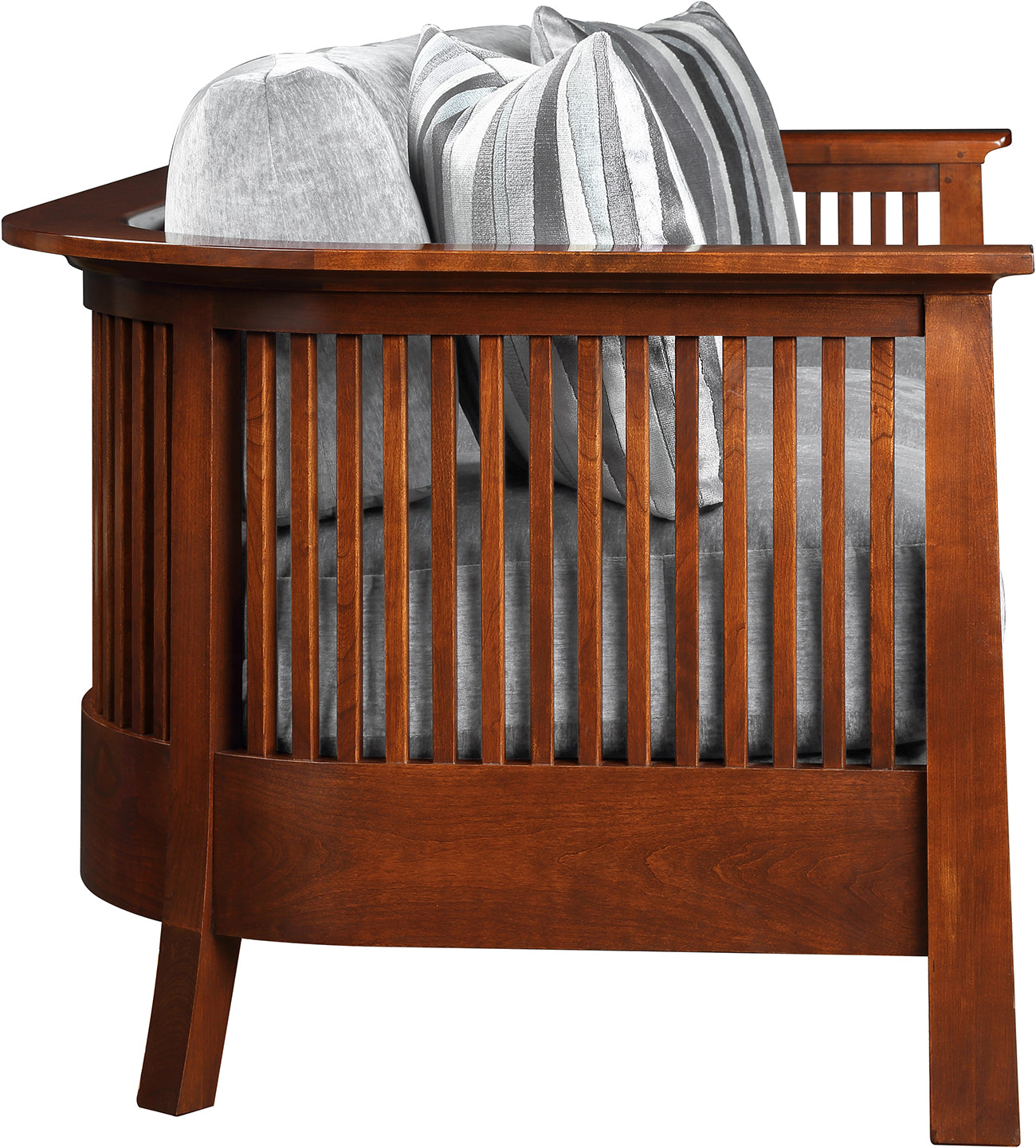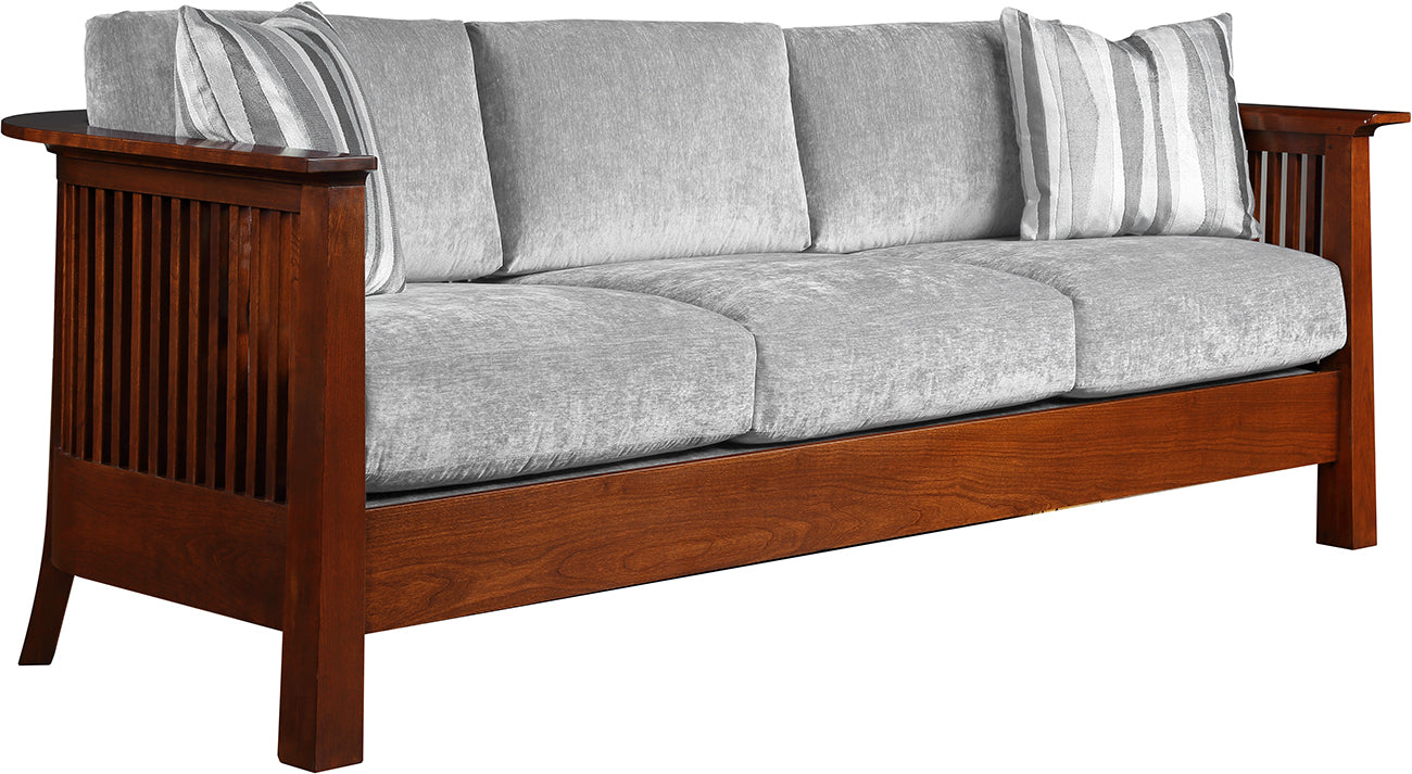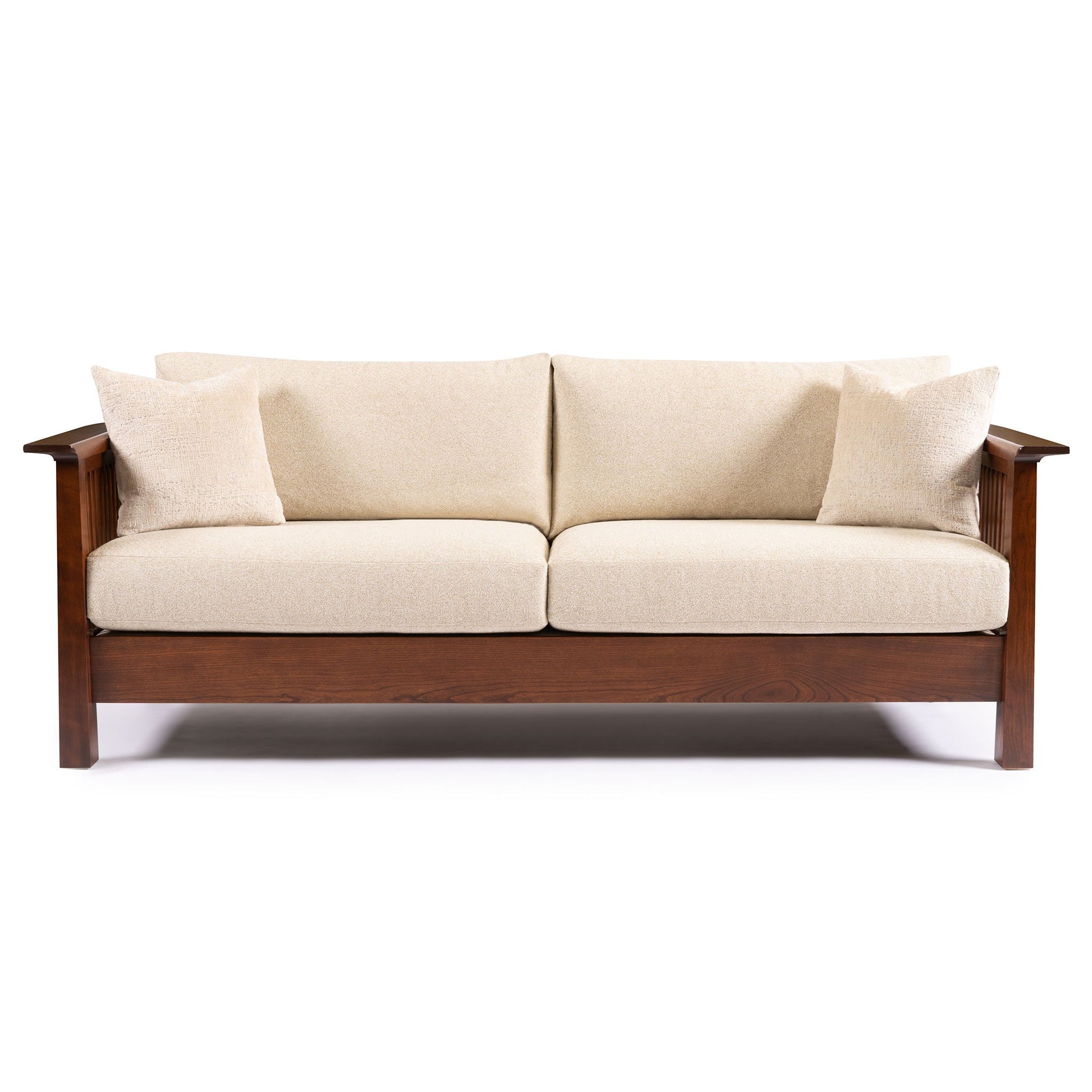 Sur le canapé Park Slope, des coussins moelleux s'intègrent à un cadre de hautes tiges qui se courbent pour former une étreinte protectrice. Ce canapé Arts and Crafts allège le regard, alliant esthétique et confort profond. Disponible en chêne massif scié sur quartier ou en cerisier.