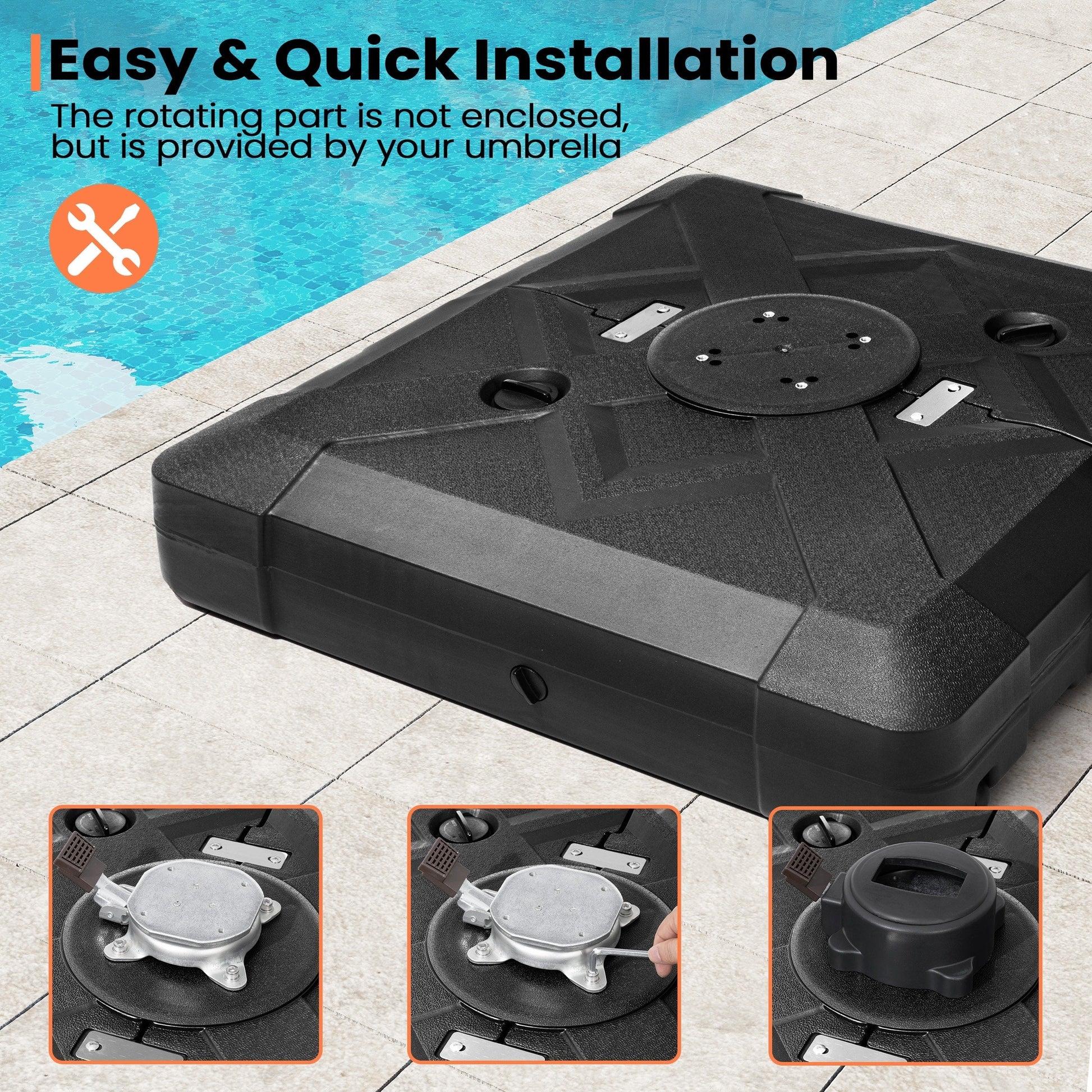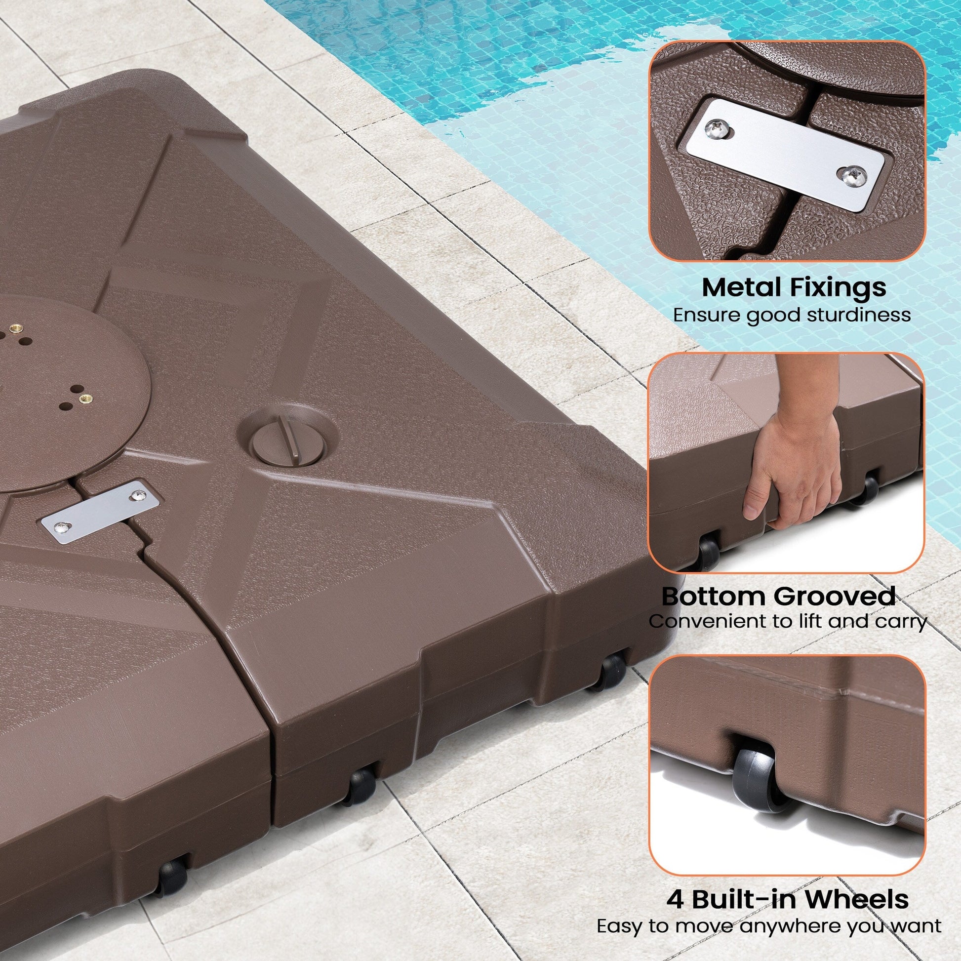 - Inclus 1 base de parasol carrée avec 4 roues