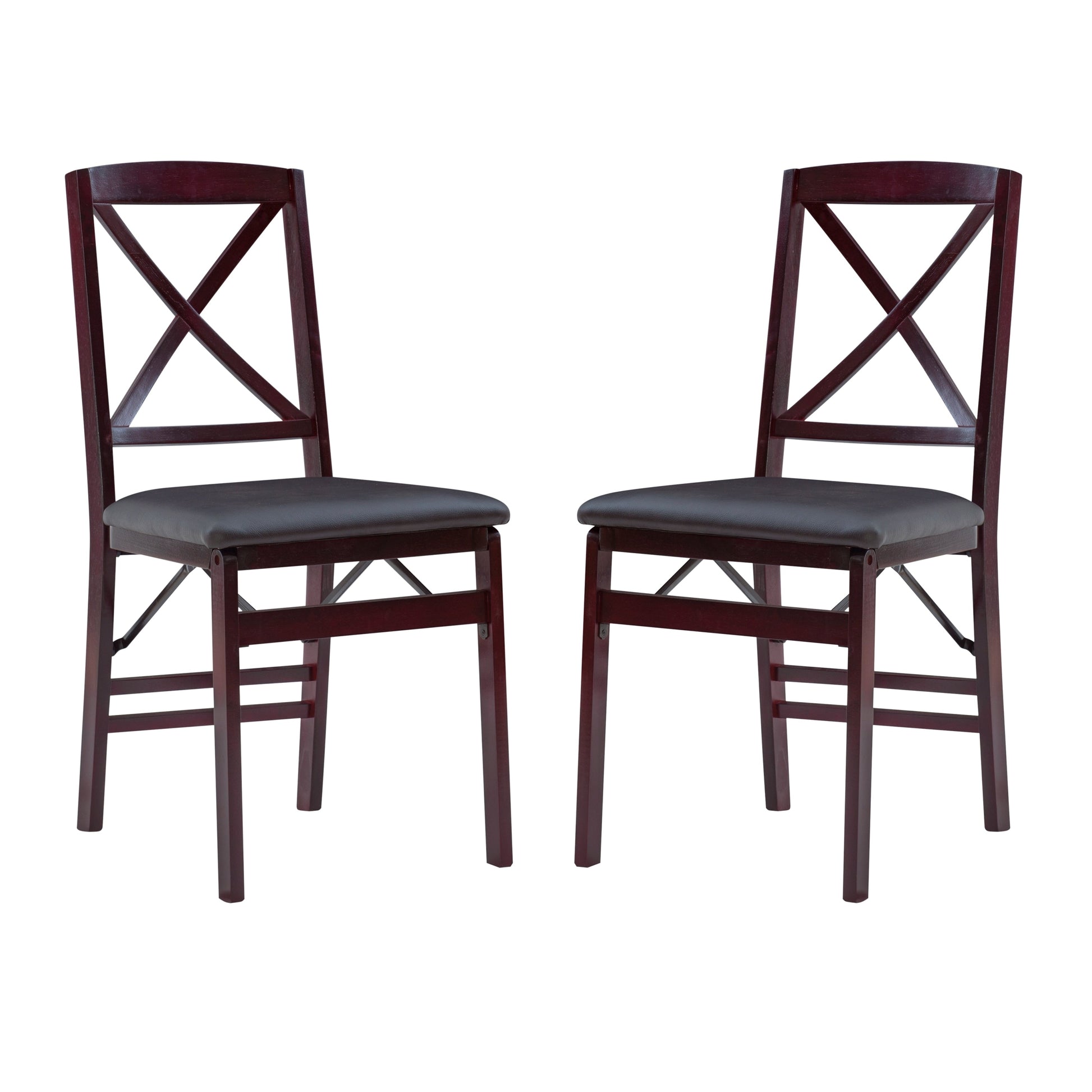 Des sièges élégants et la commodité d'une chaise pliante. Cette paire de chaises pliantes apporte une touche d'élégance supplémentaire à vos repas ou réceptions. Leur structure en bois est dotée d'un dossier classique en X et d'une assise rembourrée en similicuir, facile à nettoyer, avec une finition merlot riche. Les supports avant et arrière offrent une stabilité accrue. Pliables et peu encombrantes, ces chaises facilitent l'installation et le rangement. Aucun assemblage requis.