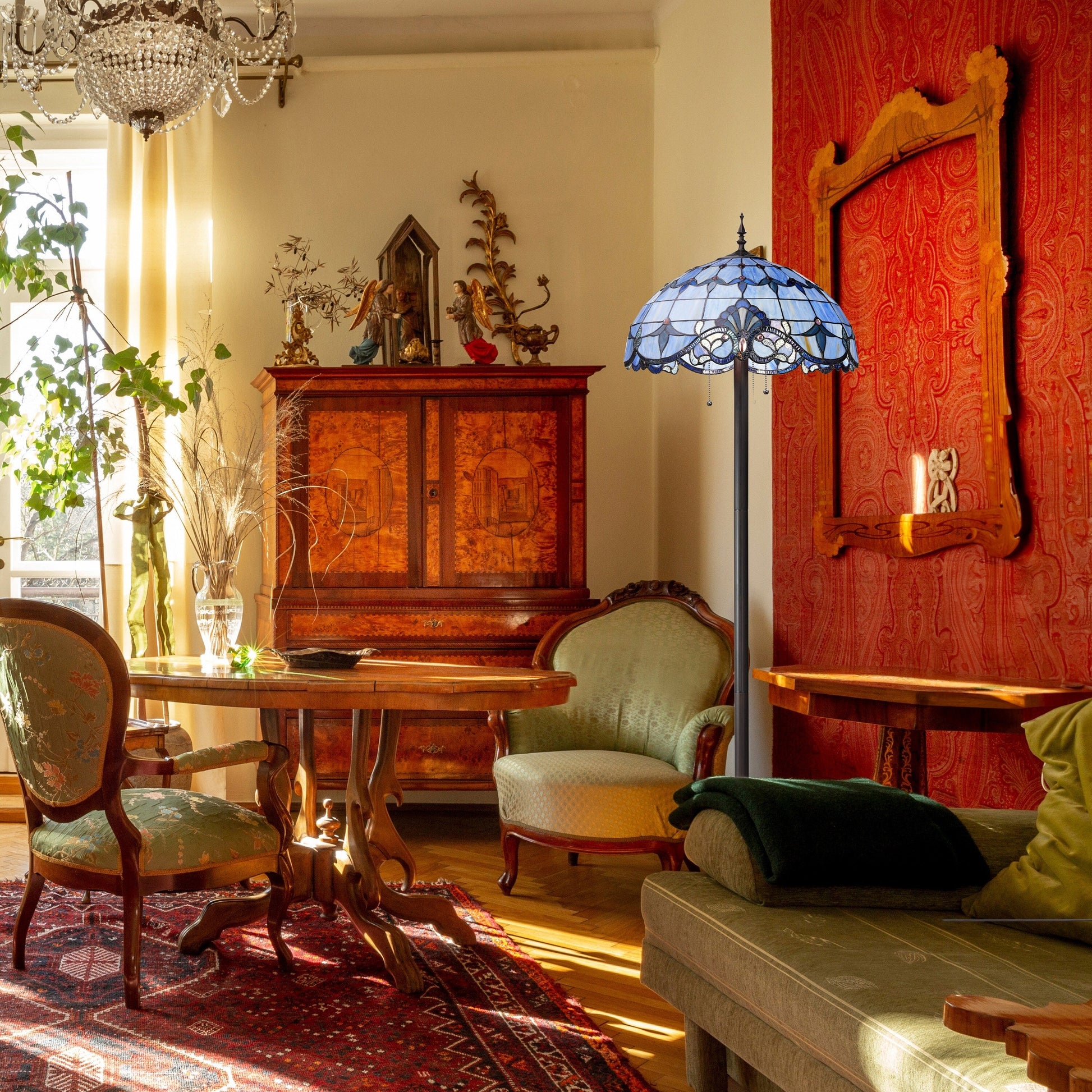 Ce lampadaire élégant arbore un design traditionnel en vitrail, ce qui en fait un ajout polyvalent à votre intérieur. Les superbes matériaux, verre bleu, métal et polyrésine, s'harmonisent parfaitement avec toutes les palettes de couleurs, tandis que la finition vieillie apporte une touche de raffinement. Son pied chandelier soutient un abat-jour en forme de bol, composé de 372 pièces de vitrail et de 51 cabochons, diffusant une lumière douce et ambiante, idéale pour créer un coin lecture chaleureux ou mettre en valeur un point focal dans votre pièce.