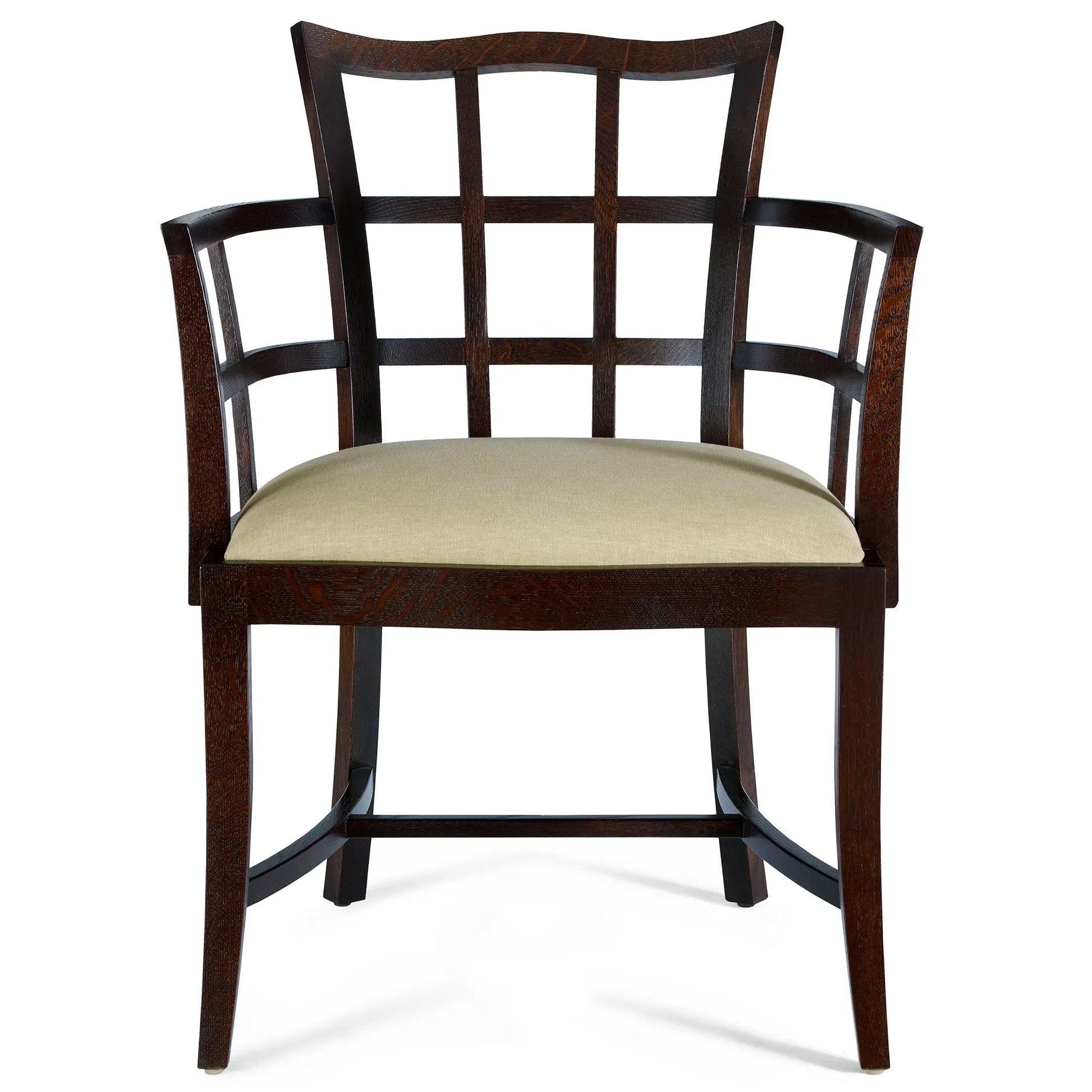 Sur nos chaises de salle à manger Surrey Hills, le motif treillis se transforme en une structure ouverte en chêne blanc pour une assise large et discrète. Les accoudoirs enveloppants et les pieds tendus s'inclinent vers l'extérieur, tandis que le dossier et l'assise rembourrés se terminent par un élégant bord serpentin.