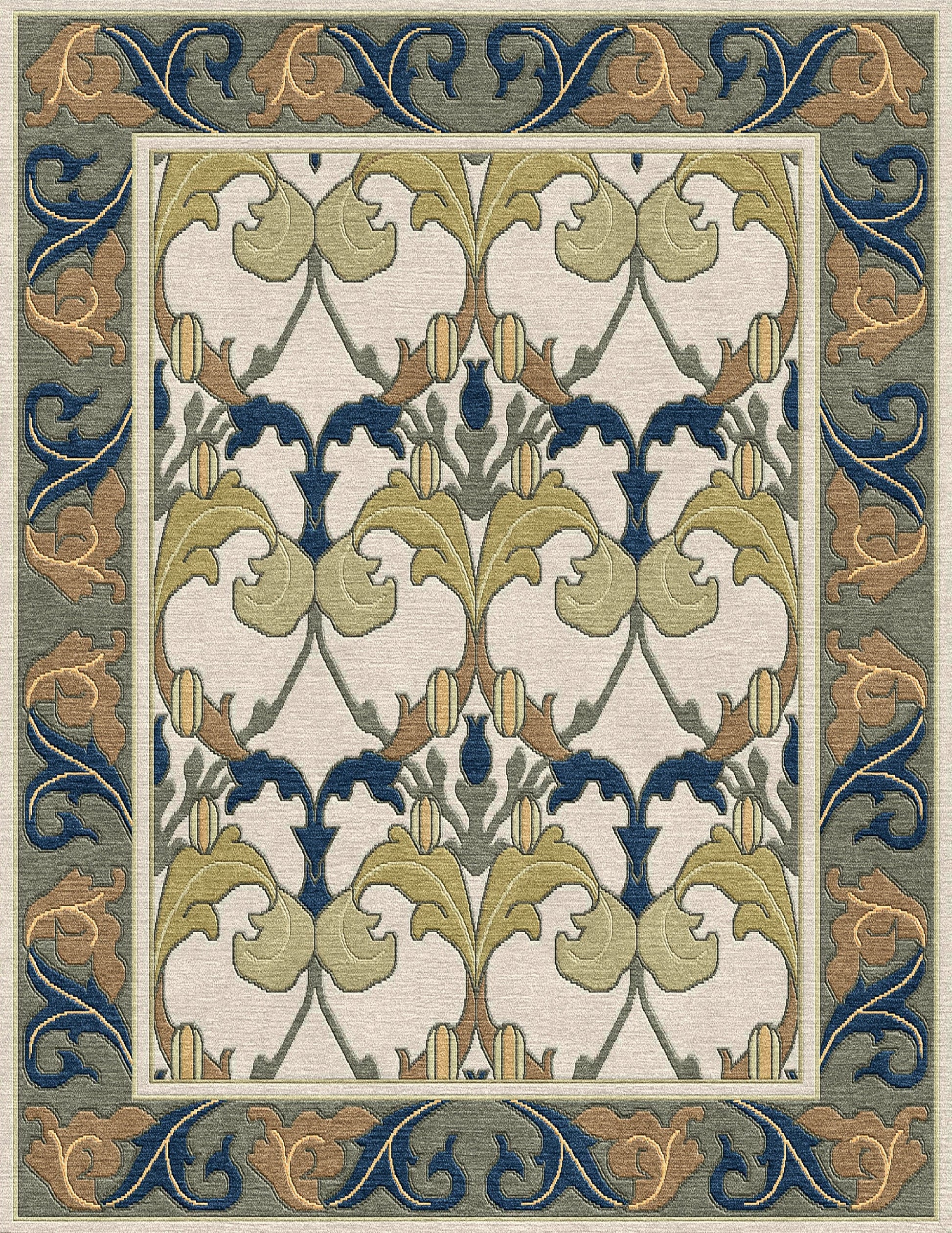 Nos derniers tapis Arts and Crafts sont des adaptations libres d'un motif de feuille d'acanthe de CFA Voysey, célèbre architecte et créateur anglais de papiers peints, tissus et tapis. Le style Border et le motif Botanical, décliné sur toute la surface, sont noués à la main en laine de mouton des hautes terres de l'Himalaya par des tisserands népalais qualifiés. Ces tapis sont disponibles en 14 tailles : rectangles, chemins de table, ronds et carrés ; des dimensions sur mesure sont également disponibles.