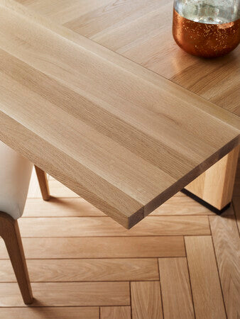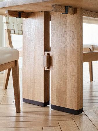 Épurée, solide et bien proportionnée, la table à manger à tréteaux Welland met en valeur la forme et les matériaux, ici le chêne blanc américain massif. Une longue traverse croise des pieds plats terminés par des manchettes métalliques, et des rallonges coulissantes permettent d'ajouter deux rallonges de 45 cm. C'est une pièce imposante qui s'adapte à une grande variété de styles de décoration.