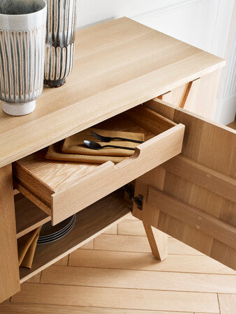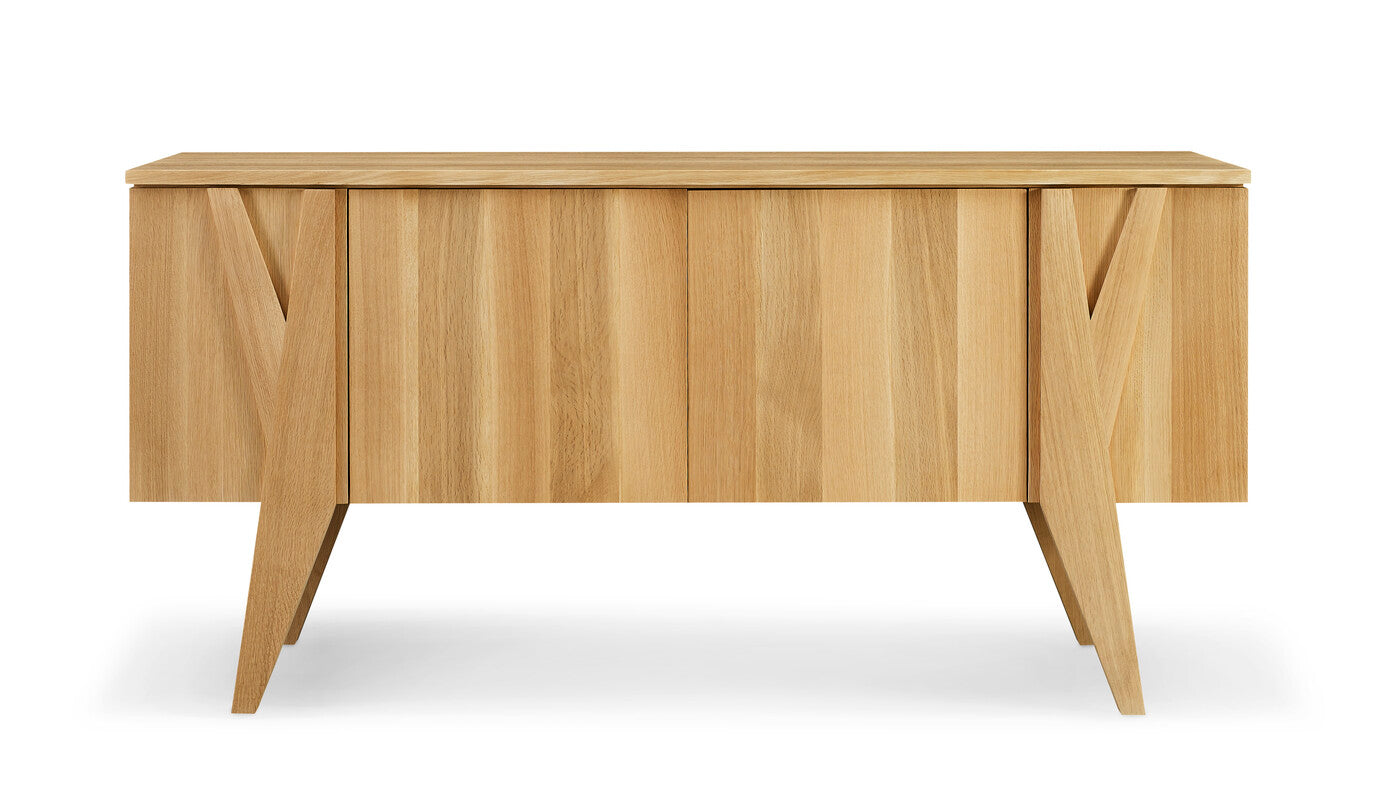Pour le buffet Yarrow, une translation verticale du pied en Y de la table est intégrée au meuble, du sol au plateau, ce qui en fait un magnifique meuble d'appoint. Deux portes à panneaux veinés verticalement révèlent deux tiroirs et une étagère fixe offrant un vaste espace de rangement. Le chêne massif et les placages confèrent au buffet sa beauté décontractée.
